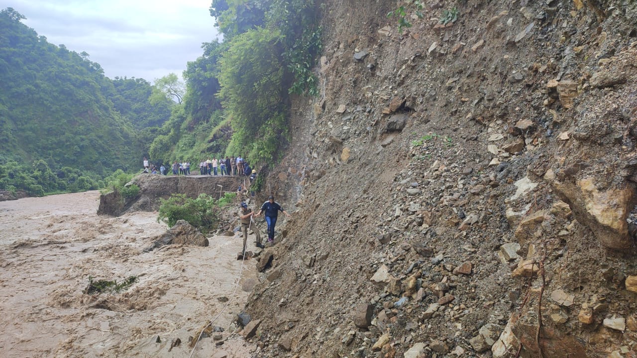 कल रात भारी वर्षा से रायपुर-थानों मोटर मार्ग पर सोंग नदी पुल का एक हिस्सा क्षतिग्रस्त।