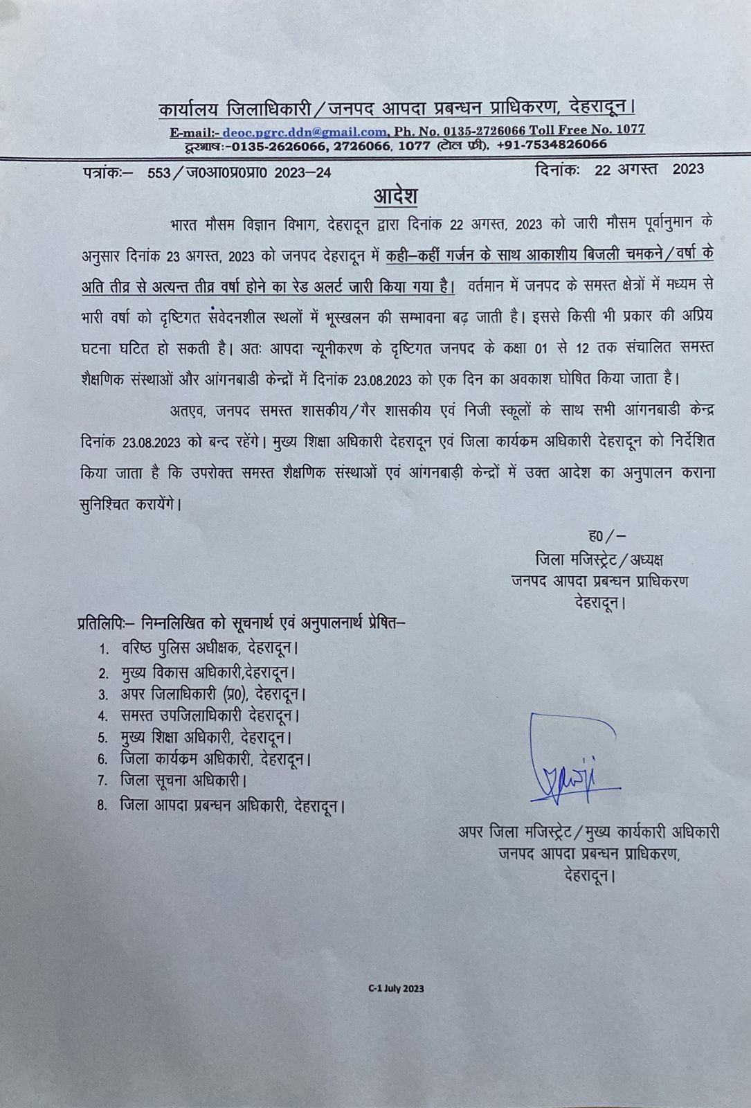 भारत मौसम विज्ञान विभाग के पूर्वानुमान के अनुसार कल अत्यन्त तीव्र वर्षा होने कारण समस्त शैक्षणिक संस्थाओं और आंगनबाडी केन्द्रों में रहेगा अवकाश। राज्य समाचार Rakesh Sharma August 22, 2023 0 282 Spread the love