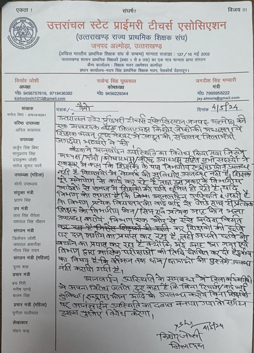 बैठक में ऑनलाइन उपस्थिति का विरोध किया गया। शिक्षकों द्वारा कहा गया कि अधिकांश शिक्षकों के पास एंड्रॉयड फोन उपलब्ध नहीं है तथा विद्यालयों में नेटवर्क की सुविधा भी उपलब्ध नहीं है।शिक्षक पूरे मनोयोग से कार्य कर रहे हैं तथा इस प्रकार के क्रियाकलापों से समाज में शिक्षकों की छवि धूमिल हो रही है यदि विभाग को ऐसा लगता है कि ऑनलाइन उपस्थिति जरूरी है तो वह पहले प्रत्येक विद्यालय में वाईफाई की सुविधा उपलब्ध करवा दे तथा प्रत्येक अध्यापक को एंड्रॉयड फोन तथा सिम उपलब्ध करवा दे उत्तराखंड प्रदेश की विषम भौगोलिक परिस्थिति में अभी तक शिक्षकों को खराब नेटवर्क से परेशानी का सामना करना पड़ता है।