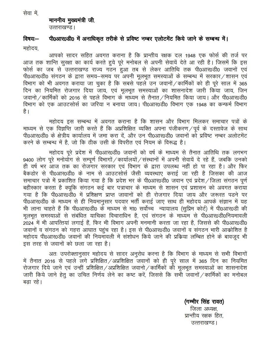 प्रान्तीय रक्षक हित संगठन के जिलाध्यक्ष गम्भीर सिंह रावत ने मुख्यमंत्री श्री पुष्कर सिंह धामी को लिखा पत्र। उन्होंने मुख्यमंत्री के संज्ञान में डाला कि प्रान्तीय रक्षक दल 1948 एक फोर्स की तर्ज पर आज तक शान्ति सुरक्षा का कार्य करते हुये पूरे मनोबल से अपनी सेवायें देते आ रही है। जिसमें कि इस फोर्स का जब से उत्तराखण्ड राज्य गठन हुआ तब से लेकर आतिथि तक पी०आर०डी० जवानों एवं पी०आर०डी० संगठन के द्वारा समय-समय पर अपनी मूलभूत समस्याओं के सम्बन्ध में सरकार / शासन एवं विभाग को भी अवगत कराया जा चुका है कि सबसे पहले उन जवानों/कार्मिकों को ही पूरे साल में 365 दिन का नियमित रोजगार दिया जाय, एवं मूलभूत समस्याओं का शासनादेश जारी किया जाय, जिन जवानो/कार्मिकों को 2016 से पहले विभाग के माध्यम से तैनात / नियमित किया जाय। और पी०आर०डी० विभाग को एक आउटसोर्स का जरिया न बनाया जाय। पी०आर०डी० विभाग एक 1948 का कन्फर्म विभाग है।