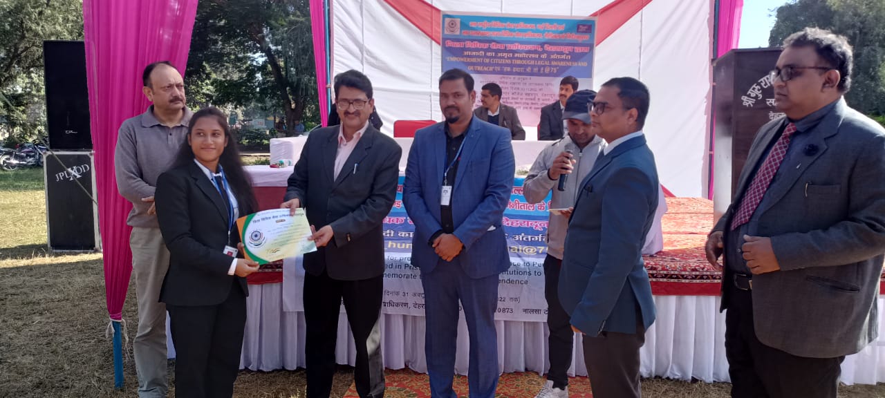 कार्यक्रम के अन्त में श्री प्रदीप पंत, जिला न्यायाधीश / अध्यक्ष, जिला विधिक सेवा प्राधिकरण देहरादून द्वारा “आजादी का अमृत महोत्सव” के अंतर्गत चलाये जा रहे “Empowerment of Citizens Through Legal Awarness and Outreach अभियान तथा “हक हमारा भी तो है @75” अभियान में सक्रिय रूप से प्रतिभाग करने वाले विभिन्न छात्रों को प्रमाण पत्र भी वितरित किये गये कार्यक्रम का संचालन जयंत जी द्वारा किया गया।