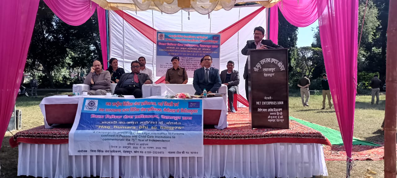 उक्त शिविर में प्रदीप पंत, जिला न्यायाधीश / अध्यक्ष, जिला विधिक सेवा प्राधिकरण देहरादून द्वारा उपस्थित प्रतिभागियों को भारत का संविधान में वर्णित अधिकारों एवं कर्तव्यों के साथ विधिक सेवा प्राधि करण अधिनियम, 1987 के प्रावधानों के सम्बंध में विस्तारपूर्वक अवगत कराया गया तथा राष्ट्रीय विधिक सेवा प्राधिकरण के निर्देशों के क्रम में जिला विधिक सेवा प्राधिकरण देहरादून द्वारा 31. 10.2022 से 13.11.2022 तक “आजादी का अमृत महोत्सव के अंतर्गत चलाये जा रहे Empowerment of Citizens Through Legal Awarness and Outreach ” अभियान तथा “हक हमारा भी तो है (@75” अभियान के उददेश्यों एवं लाभों के सम्बन्ध में जानकारी दी। महिलाओं के अधिकारों एवं देवभूमि उत्तराखण्ड में नशे की समस्या के सम्बन्ध में भी उपस्थित आमजन को जागरूक किया गया। हर्ष यादव, वरिष्ठ सिविल जज / सचिव जिला विधिक सेवा प्राधिकरण देहरादून द्वारा माननीय राष्ट्रीय विधिक सेवा प्राधिकरण नई दिल्ली एवं मा० उत्तराखण्ड राज्य विधिक सेवा प्राधिकरण, नैनीताल के निर्देशानुसार दिनांक 31.102022 से दिनांक 13.11.2022 तक जिला विधिक सेवा प्राधिकरण देहरादून द्वारा “आजादी का अमृत महोत्सव” के अंतर्गत चलाये गये “Empowerment of Citizens Through Legal Awarness and Outreach ” अभियान एवं “हक हमारा भी तो है @75” अभियान के सम्बन्ध में विस्तारपूर्वक जानकारी दी यह भी अवगत कराया कि “हक हमारा भी तो है @75” अभियान के प्रभावी क्रियान्वयन हेतु कोर टीम एवं फील्ड टीमों का गठन किया गया था, जिसमें जनपद देहरादून के विभिन्न विधि महाविद्यालयों / विश्वविद्यालयों के छात्रों को भी सम्बद्ध किया गया था, उक्त टीमों द्वारा जिला कारागार एवं सम्प्रेक्षण गृह में बन्द व्यक्तियों / बालको के साक्षात्कार कर सूचनायें संकलित की गई हैं।