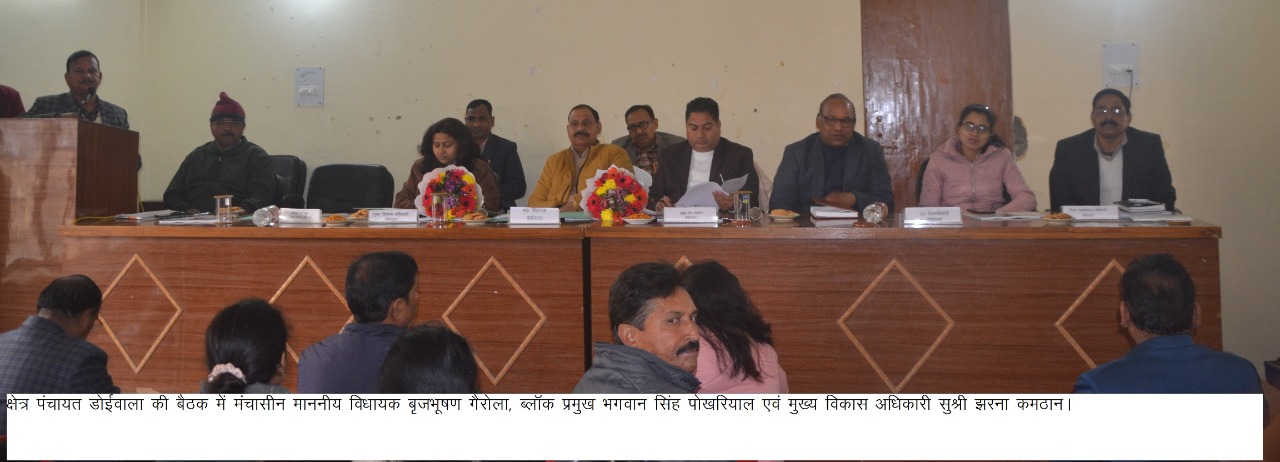 डोईवाला ब्लॉक सभागार मे ब्लाॅक प्रमुख भगवान सिंह पोखरियाल की अध्यक्षता में क्षेत्र पंचायत की बैठक आहुत हुई। बैठक में डोईवाला के विधायक बृजभूषण गैरोला, मुख्य विकास अधिकारी सुश्री झरना कामठान एवं जिला स्तरीय विभगाीय अधिकारी मौजूद रहे। इस दौरान क्षेत्रीय विधायक श्री गैरोला ने उपस्थित अधिकारियों से गत बैठक दी गई दिशा-निर्देशों के अनुपालन में कार्यप्रगति की भी विस्तृत जानकारी लेते हुए जनप्रतिनिधियों द्वारा अपने-2 क्षेत्र की उठाई गई समस्याओं का त्वरित निस्तारण के आवश्यक दिशा-निर्देश दिए। साथ ही कहा कि जिन समस्या/कार्य का निस्तारण अपने विभागीय उच्चाधिकारी द्वारा किया जाना है ऐसी शिकायतों को अपने विभाग से समन्वय करते हुए प्राथमिकता के आधार पर निस्तारण करना सुनिश्चित करेंगे। वहीं मुख्य विकास अधिकारी ने उपस्थित अधिकारियों का कड़े निर्देश देते हुए कहा कि सदन में जनप्रतिनिधियों द्वारा उठाई गई समस्याओं/शिकायतों को अक्षरशः अंकित करते हुए निर्धारित समय के भीतर निस्तारित करना सुनिश्चित करेंगे। क्षेत्र में संचालित कार्यों को गुणवत्तापूर्वक समयसीमा के भीतर पूर्ण करना सुनिश्चत करेंगे।