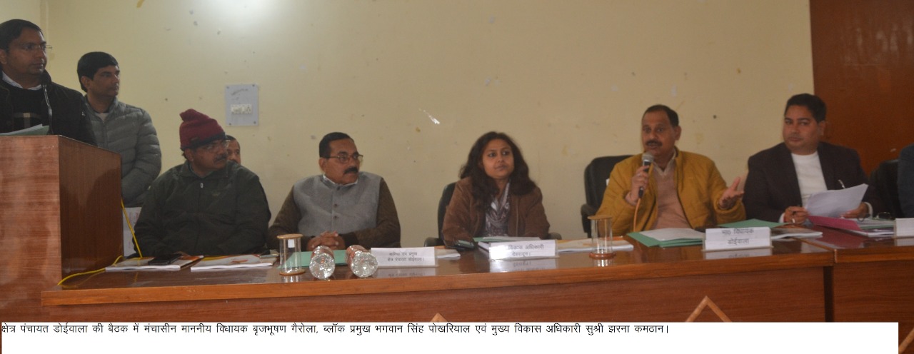 (डोईवाला के विधायक बृजभूषण गैरोला, मुख्य विकास अधिकारी सुश्री झरना कामठान एवं जिला स्तरीय विभगाीय अधिकारी मौजूद रहे)