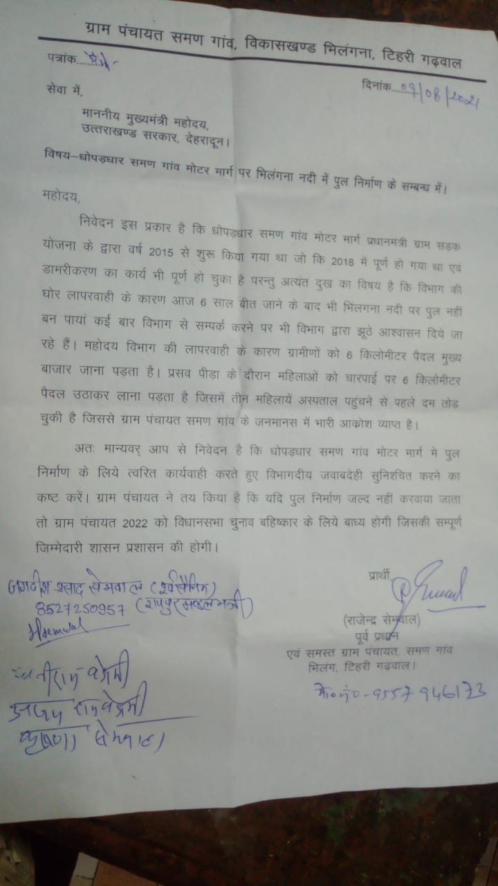 (समण गांव भिलंगना नदी में पुल बनाए जाने के संबंध में)