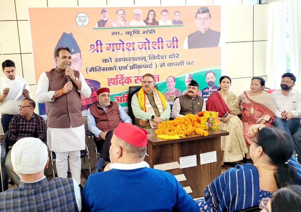 कार्यक्रम में 20 सूत्री कार्यक्रम क्रियान्वयन समिति के माननीय उपाध्यक्ष आदरणीय ज्योति प्रसाद गैरोला जी ने भी मंत्री जी को विदेश सफल दौरे की शुभकामनाएं दी। और सभी कार्यकर्ताओं को बताया कि गणेश जोशी जी का विशेष लगाओ अपनी विधानसभा के सभी कार्यकर्ताओं से रहता है जिसका एहसास यह दिख रहा है कि आज आपका स्वागत करने के लिए यहां पर सैकड़ो कार्यकर्ता उपस्थित रहे हैं। आपके द्वारा विदेश दौरे से जो नई तकनीक के द्वारा कृषि क्षेत्र में विकास होगा और प्रदेश को नई गति प्रदान करेगा।