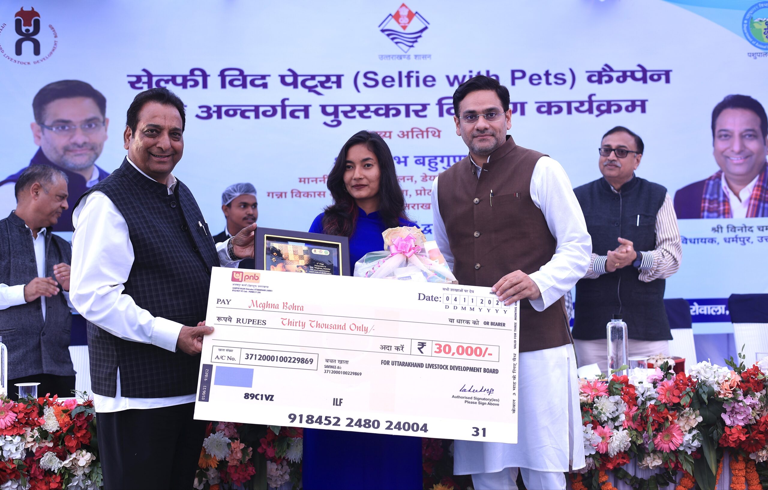 श्री बहुगुणा ने बताया कि, “सेल्फी विद पेट” पशुपालन विभाग का जनमानस को पालतू पशुओं के प्रति प्रेम करने हेतु जागृत करने का एक अभिनव प्रयोग है। इस प्रतियोगिता में दिनांक 7 जुलाई 2023 से दिनांक 10 अगस्त 2023 तक उत्तराखंड के समस्त निवासियों से अपने पालतू जानवरों के साथ खींची गयी एक सेल्फी, कहानी के साथ विभाग के किसी भी सोशल मीडिया अकाउंट पर अपलोड करने का अनुरोध किया गया था। प्राप्त सभी सेल्फी का सचिव पशुपालन विभाग की अध्यक्षता में गठित एक समिति द्वारा मूल्यांकन किया गया। इस प्रकार प्राप्त कुल 25 प्रविष्टियों में से श्री दीक्षा वर्मा निवासी हल्द्वानी को प्रथम, कुमारी मेघना निवासी नैनीताल को द्वितीय एवं मनोहर कन्याल डीडीहाट, पिथौरागढ़ को तृतीय स्थान प्राप्त हुआ। प्रथम पुरुस्कार के रूप में पचास हजार रुपये एवं प्रशस्ति पत्र, द्वितीय पुरस्कार के रूप में रुपये तीस हजार एवं एक प्रशस्ति पत्र तथा तृतीय पुरस्कार के रूप में रुपये पन्द्रह हजार एवं प्रशस्ति पत्र प्रदान किया गया। इसके अतिरिक्त सभी 25 प्रतिभागियों को प्रशस्ति पत्र देकर सम्मानित किया गया। इसके अलावा कार्यक्रम में मंत्री श्री बहुगुणा द्वारा अपनी पॉकेट मनी से निराश्रित पशुओं का उपचार करने वाली उत्तरकाशी निवासी कुमारी ख़ुशी नोटियाल को रुपये ग्यारह हजार के विशेष पुरस्कार से सम्मानित किया।
