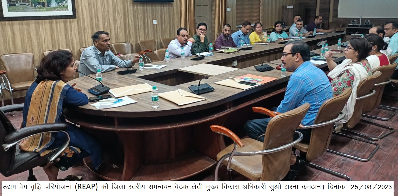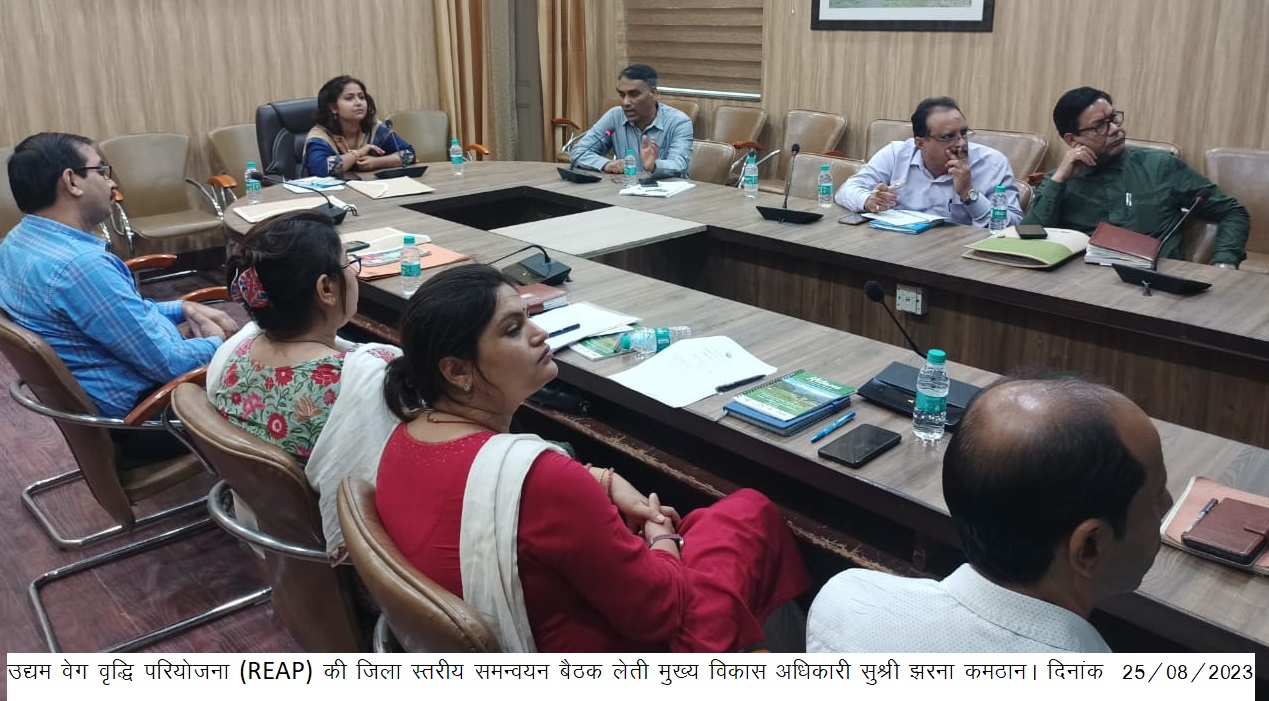 जिलाधिकारी के निर्देशों के क्रम में मुख्य विकास अधिकारी सुश्री झरना कमठान की अध्यक्षता में ऋषिपर्णा सभागार कलेक्टेªट में उत्तराखण्ड ग्राम्य विकास समिति अन्तर्गत गठित ग्रामीण उद्यम वेग वृद्धि परियोजना (REAP) की जिला स्तरीय समन्वयन बैठक आहुत की गयी। बैठक में जिला स्तरीय विभिन्न रेखीय विभागों के अधिकारियों ने प्रतिभाग किया।