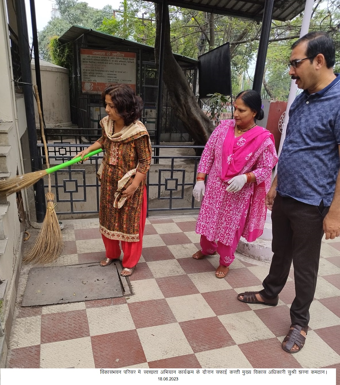 मा0 उच्च न्यायालय, उत्तराखण्ड, नैनीताल द्वारा दिये गये निर्देशों के अनुपालन में 12 जून 2023 से स्वच्छता जागरूकता सप्ताह एवं 18 जून 2023 दिन-रविवार को प्रातः 08ः00 बजे से बृहद स्तर पर श्रमदान के माध्यम से स्वच्छता कार्यक्रम आयोजित किया जाने हेतु दिए गए निर्देशों के अनुपालन में आज मुख्य विकास अधिकारी सुश्री झरना कमठान, की उपस्थिति में विकास भवन कार्यालय कक्षों एवं भवन परिसर में स्वच्छता अभियान के अन्तर्गत सफाई कार्य किया गया। इस अवसर पर मुख्य विकास अधिकारी ने कार्यालय परिसर में झाड़ू लगाकर सफाई अभियान में प्रतिभाग किया।