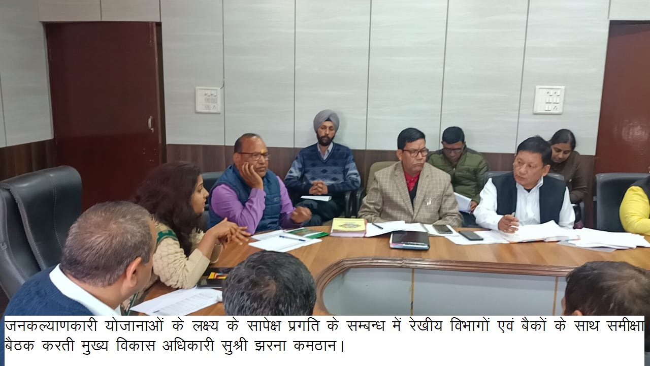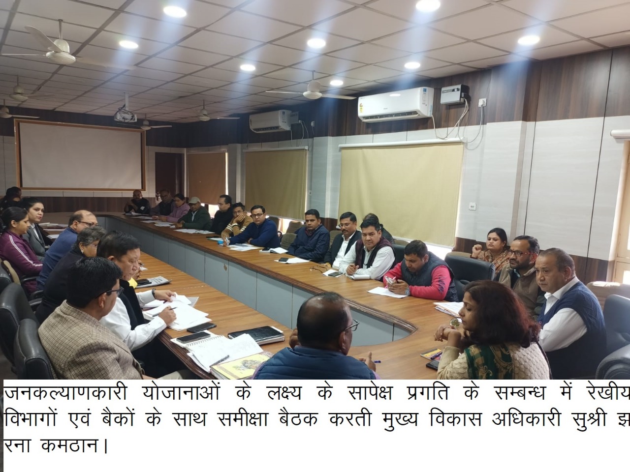 सरकार की जनकल्याणकारी योजनाओं का लाभ जनमानस तक पंहुचाने तथा विभागों एवं बैंकों द्वारा इस हेतु किये जा रहे प्रयासों एवं कार्यों की प्रति सप्ताह समीक्षा के लिये जिलाधिकारी के निर्देशों के क्रम में मुख्य विकास अधिकारी सुश्री झरना कमठान ने विकास भवन सभागार में रेखीय विभागों के साथ ही बैंक के प्रबन्धकों एवं प्रतिनिधियों के साथ बैठक आयोजित की गई।