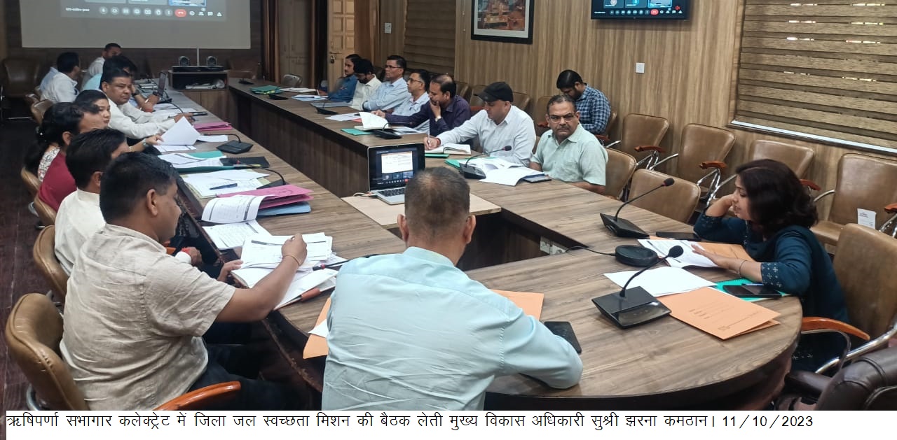 मुख्य विकास अधिकारी सुश्री झरना कमठान की अध्यक्षता में ऋषिपर्णा सभागार कलेक्टेट में जिला जल स्वच्छता मिशन की बैठक आयोजित की गई। मुख्य विकास अधिकारी ने सम्बन्धित अधिकारियों को निर्देशित किया कि जिला जल स्वच्छता मिशन के अन्तर्गत संचालित कार्यों को दिसम्बर 2023 तक पूर्ण कर लिया जाए। उन्होंने योजनाओं को पूर्ण करने में राजस्व एवं वन विभाग से सम्बन्धित प्रकरणों पर विभागीय अधिकारियों को आपसी समन्वय करते हुए निस्तारण करने के निर्देश दिए।