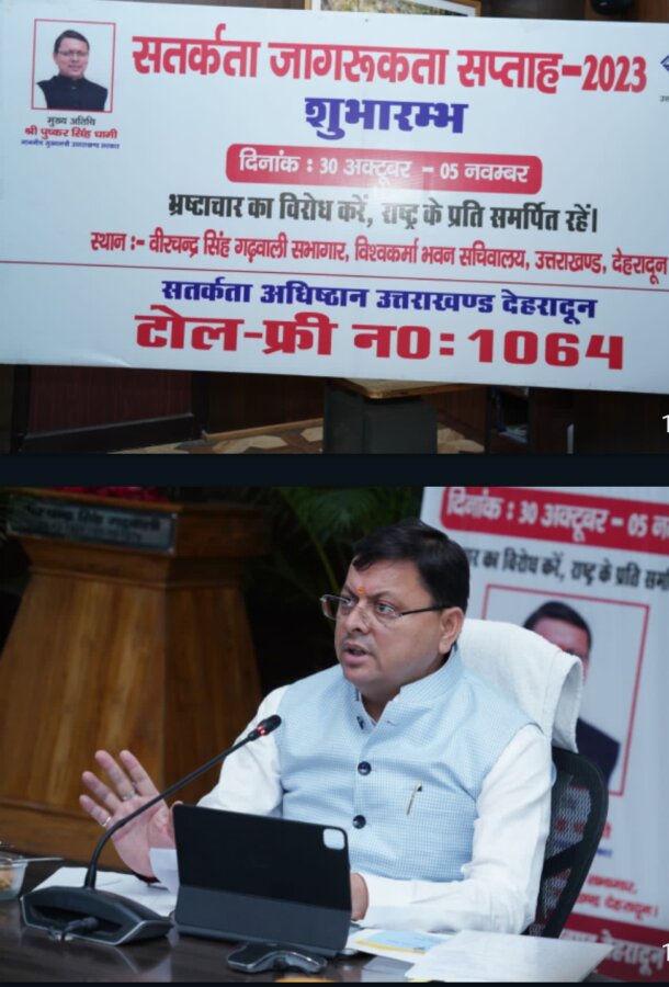 मुख्यमंत्री श्री पुष्कर सिंह धामी ने 30 अक्टूबर से 05 नवम्बर 2023 तक चलने वाले सतर्कता सप्ताह के अन्तर्गत ‘‘भ्रष्टाचार का विरोध करें, राष्ट्र के प्रति समर्पित रहें’’ कार्यक्रम का शुभारंभ किया। सचिवालय में आयोजित कार्यक्रम में मुख्यमंत्री ने घोषणा की कि सतर्कता विभाग में 103 नये पद सृजित किये जायेंगे। सतर्कता विभाग की कार्यप्रणाली को प्रभावी रूप से और बेहतर बनाने के लिए सर्विलांस व तकनीकि विशेषज्ञों की टीम का गठन किया जायेगा। इस अवसर पर मुख्यमंत्री ने अपने कार्यक्षेत्र में सराहनीय कार्य करने वाले सतर्कता विभाग के इंस्पेक्टरa तुषार बोहरा, इंस्पेक्टर भानु प्रकाश आर्य, एएसआई श्री दिवाकर शर्मा और कांस्टेबल नवीन कुमार को सम्मानित किया। मुख्यमंत्री ने अधिकारियों और कर्मचारियों को सत्यनिष्ठा की प्रतिज्ञा भी दिलाई।