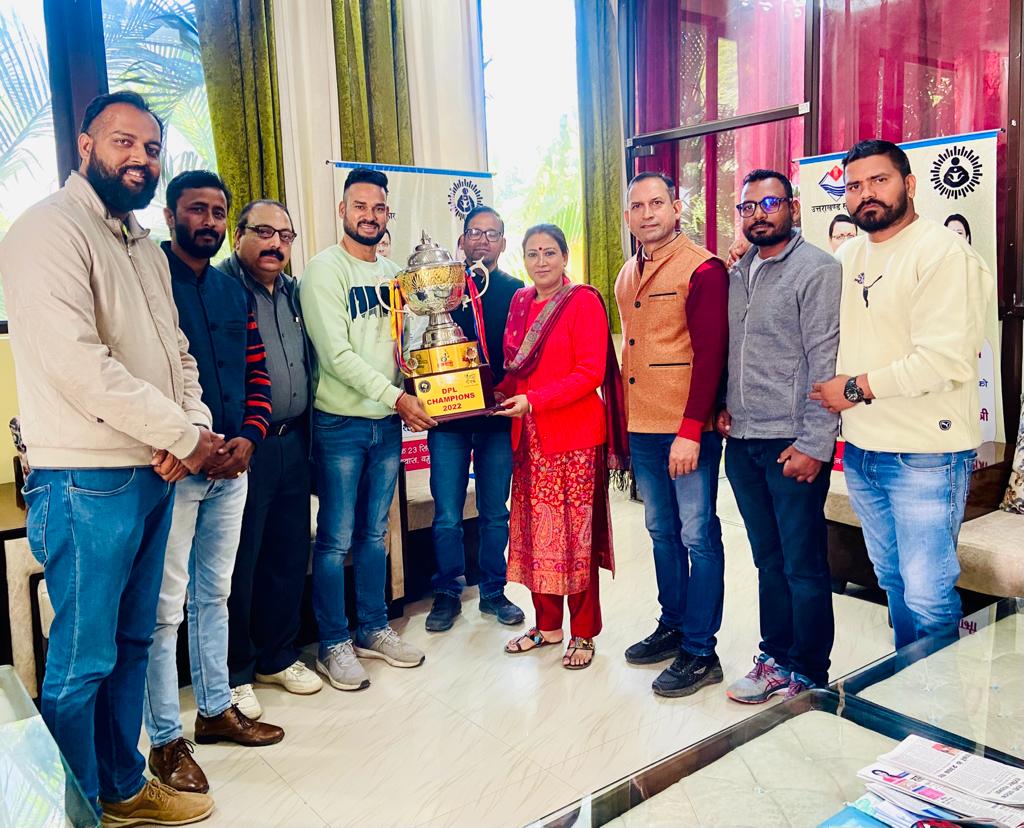 डिपार्टमेंटल क्रिकेट डेवलपमेंट कमेटी ऑफ उत्तराखंड द्वारा आयोजित प्रथम डिपार्टमेंटल प्रीमियर लीग के विजेता ऊर्जा पावर पैंथर्स की टीम ने आज माननीय खेल मंत्री श्रीमती रेखा आर्य जी से शिष्टाचार भेंट कर प्रतियोगिता के आयोजन में उनके सहयोग हेतु आभार प्रकट किया।