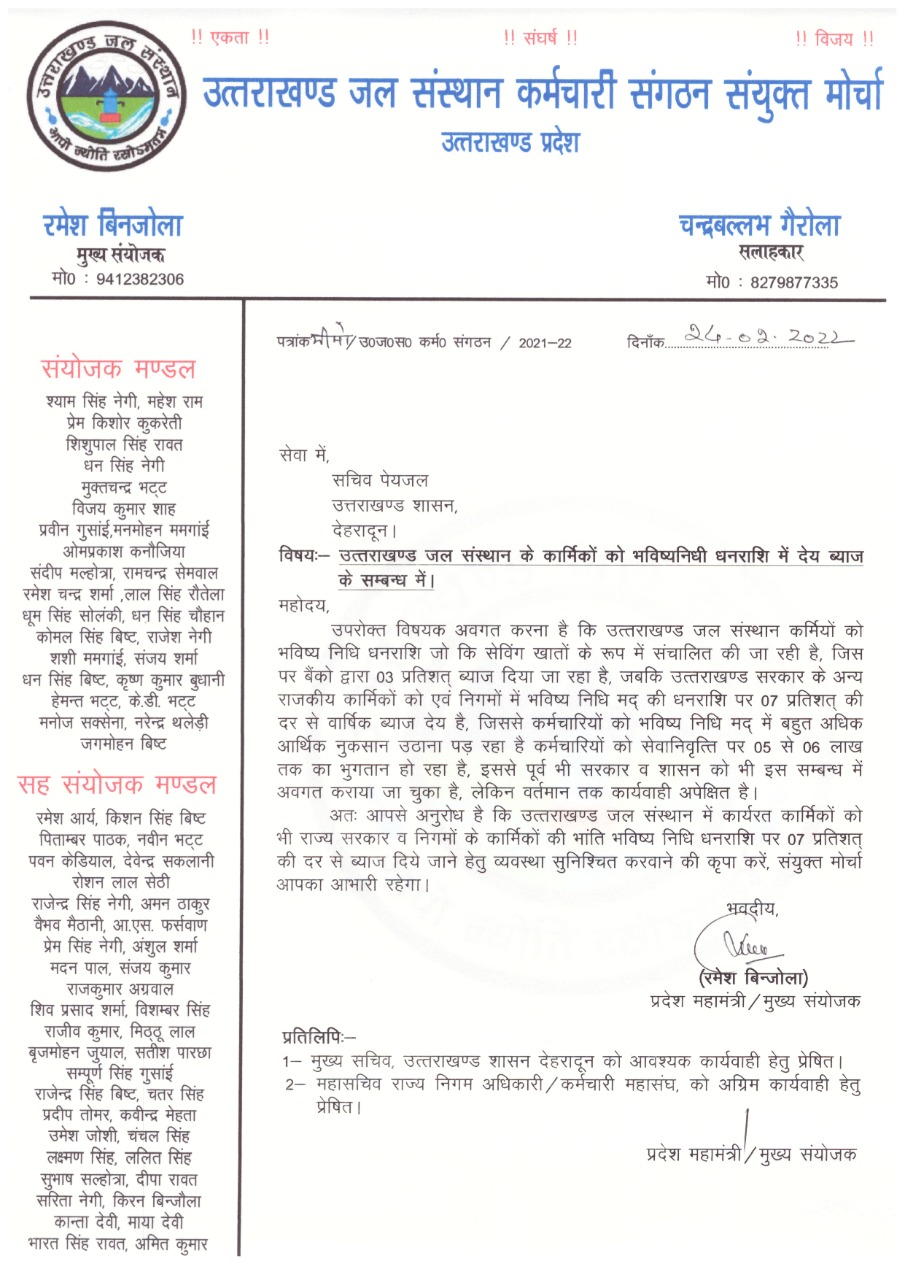 देहरादून उत्तराखंड जल संस्थान कर्मचारी संगठन संयुक्त मोर्चा ने पेयजल सचिव उत्तराखंड शासन को भविष्य निधि मद में देय ब्याज के संबंध में ज्ञापन प्रेषित किया।