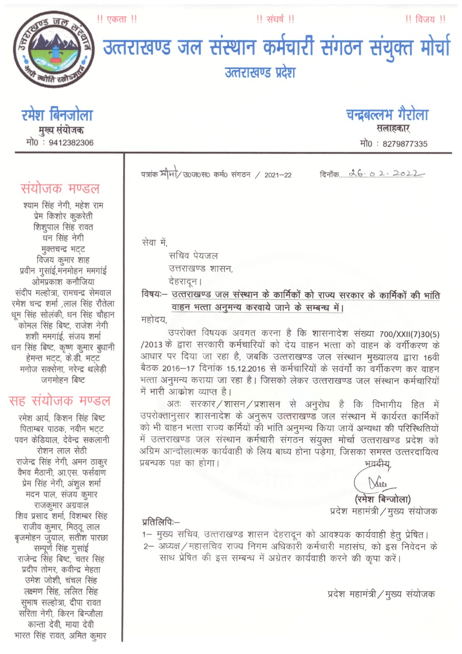 देहरादून उत्तराखंड जल संस्थान कर्मचारी संगठन संयुक्त मोर्चा द्वारा पेयजल सचिव उत्तराखंड शासन को जल संस्थान के कार्मिकों को राज्य सरकार के कार्मिकों की भांति वाहन भत्ता अनुमन्य कराए जाने एवं भविष्य निधि मद में देय ब्याज के संबंध में ज्ञापन प्रेषित किया।