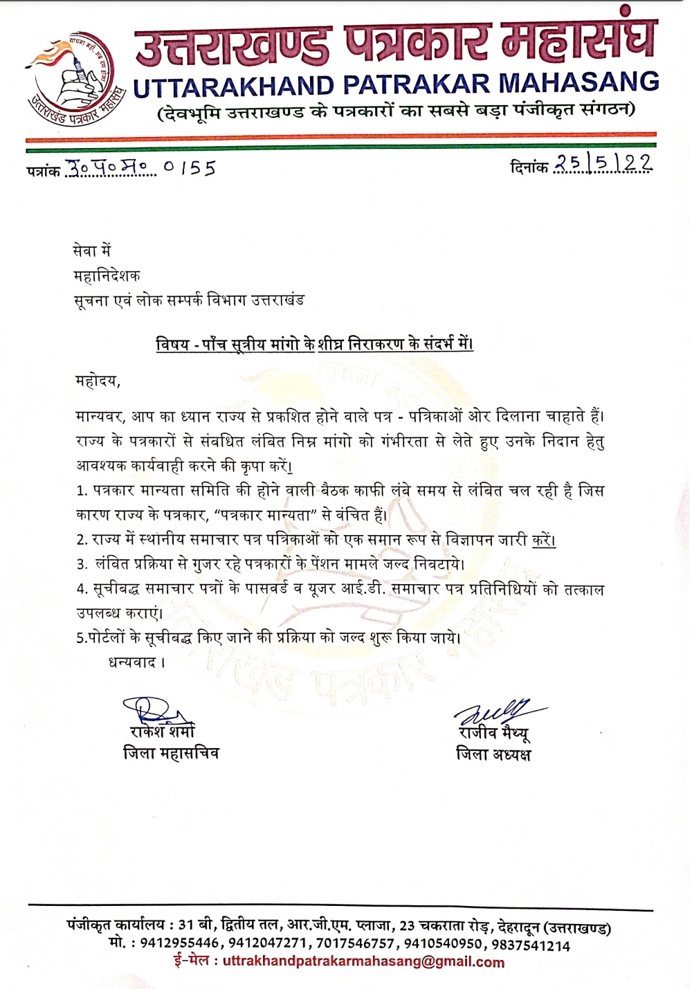 उत्तराखंड पत्रकार महासंघ कि पांच सूत्रीय मांग निम्न हैं।