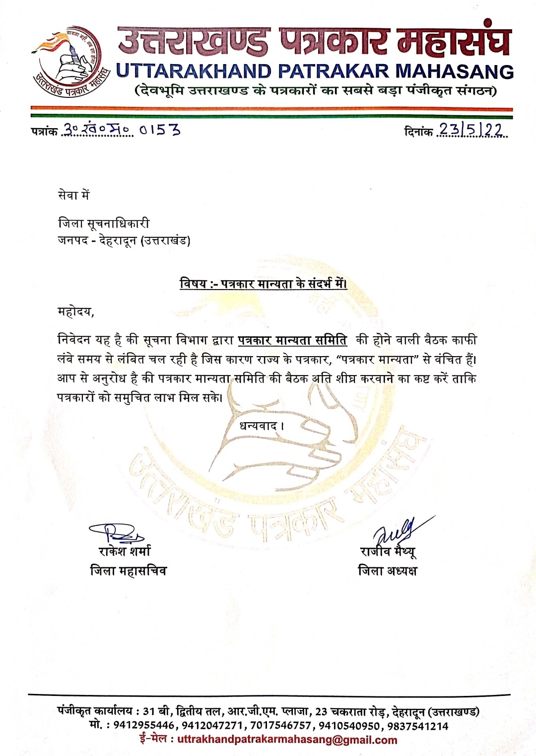 जिला सूचना अधिकारी श्री बद्री चंद जी ने मान्यता मीटिंग को जल्द कराने का आश्वासन दिया ।