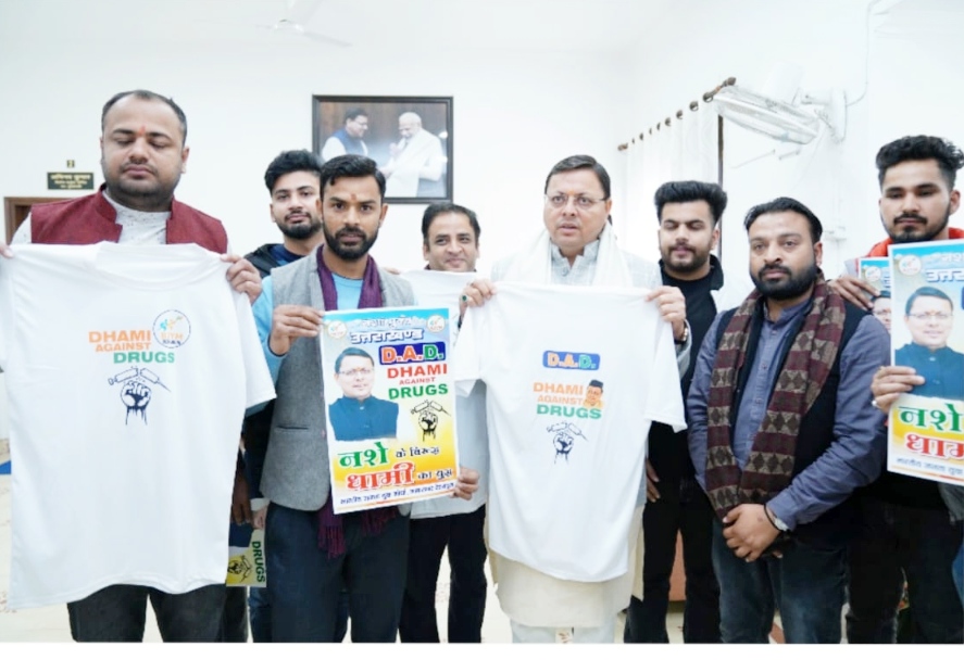 भारतीय जनता युवा मोर्चा महानगर देहरादून के अध्यक्ष देवेंद्र सिंह बिष्ट के नेतृत्व में चलाए जाने वाले धामी अगेंस्ट ड्रग्स अभियान का शुभारंभ आज उत्तराखंड के मुख्यमंत्री पुष्कर सिंह धामी ने टी-शर्ट और पोस्टर का विमोचन कर किया।।