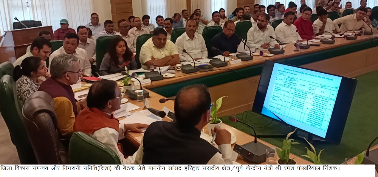 माननीय सांसद हरिद्वार संसदीय क्षेत्र/पूर्व केन्द्रीय मंत्री श्री रमेश पोखरियाल निंशक की अध्यक्षता में जिला विकास समन्वय और निगरानी समिति(दिशा) की बैठक मंथन सभागार राजपुर रोड में आयेजित की गई। बैठक में राष्ट्रीय राजमार्ग प्राधिकरण, राष्ट्रीय राजमार्ग, लोनिवि, पीएमजीएसवाई, एमडीडीए, नगर निगम, स्मार्ट सिटी, स्वास्थ्य, जल संस्थान/जल निगम, विद्युत, शिक्षा, समाज कल्याण, बाल विकास, मनरेगा, सिंचाई सहित 30 विभागों में संचालित योजनाओं की समीक्षा की गई।