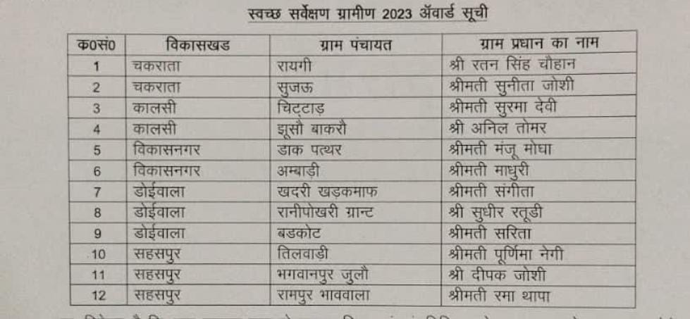 जिला विकास अधिकारी सुशील मोहन डोभाल ने अवगत कराया है कि स्वच्छ सर्वेक्षण ग्रामीण 2023 के अन्तर्गत जनपद स्तर पर जनसंख्या श्रेणी के स्व-मूल्यांकन एवं सहकर्मी सत्यापन के आधार पर चयनित श्रेष्ठ ग्राम पंचायतों को पुरस्कृत किया जा रहा है। जनपद देहरादून से इस श्रेणी में 12 ग्राम पंचायतों का चयन जिला जल एवं स्वच्छता मिशन द्वारा किया गया है।