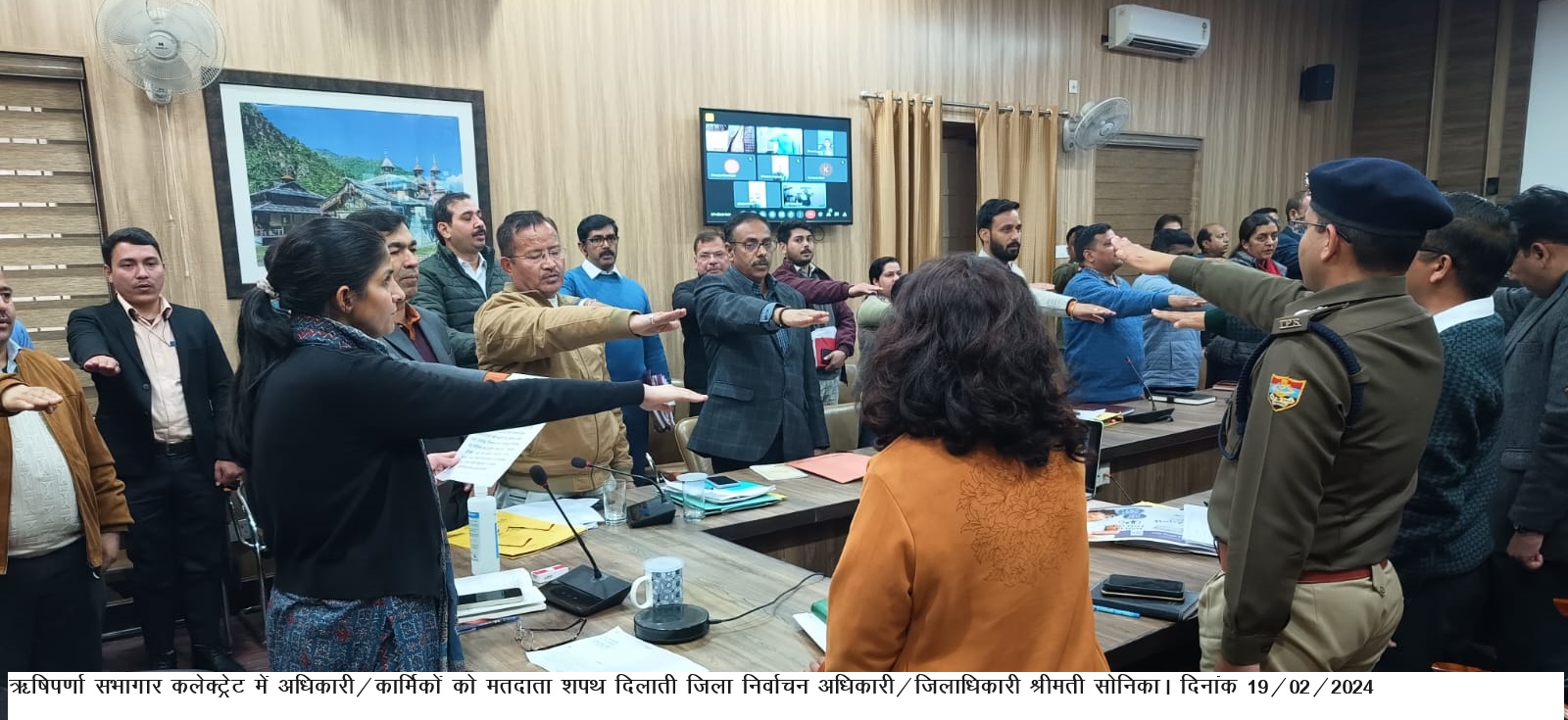 जिला निर्वाचन अधिकारी/जिलाधिकारी श्रीमती सोनिका ने कलेक्ट्रेट परिसर उपस्थित जिला स्तरीय अधिकारियों को मतदाता शपथ दिलाई।