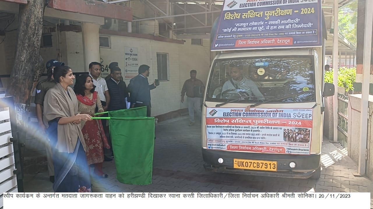 जिला निर्वाचन अधिकारी/जिलाधिकारी श्रीमती सोनिका द्वारा आज जिला कार्यालय कलेक्टेट से स्वीप के कार्यक्रम के तहत मतदाता जागरूकता वाहन को हरी झण्डी दिखाकर रवाना किया। इस वाहन के माध्यम से जनपद कि विभिन्न विधानसभाओं में भ्रमण कर मतदाता जागरूकता कार्यक्रम के तहत मतदाताओं निर्वाचक नामावाली में जोड़ने, संशोधन, नाम हटाने तथा लोकतंत्र में मतदाताओं की भागीदारी के सम्बन्ध प्रचार-प्रसार किया जाएगा।