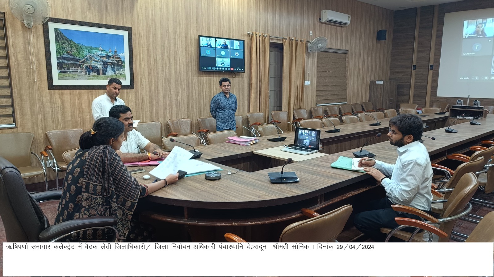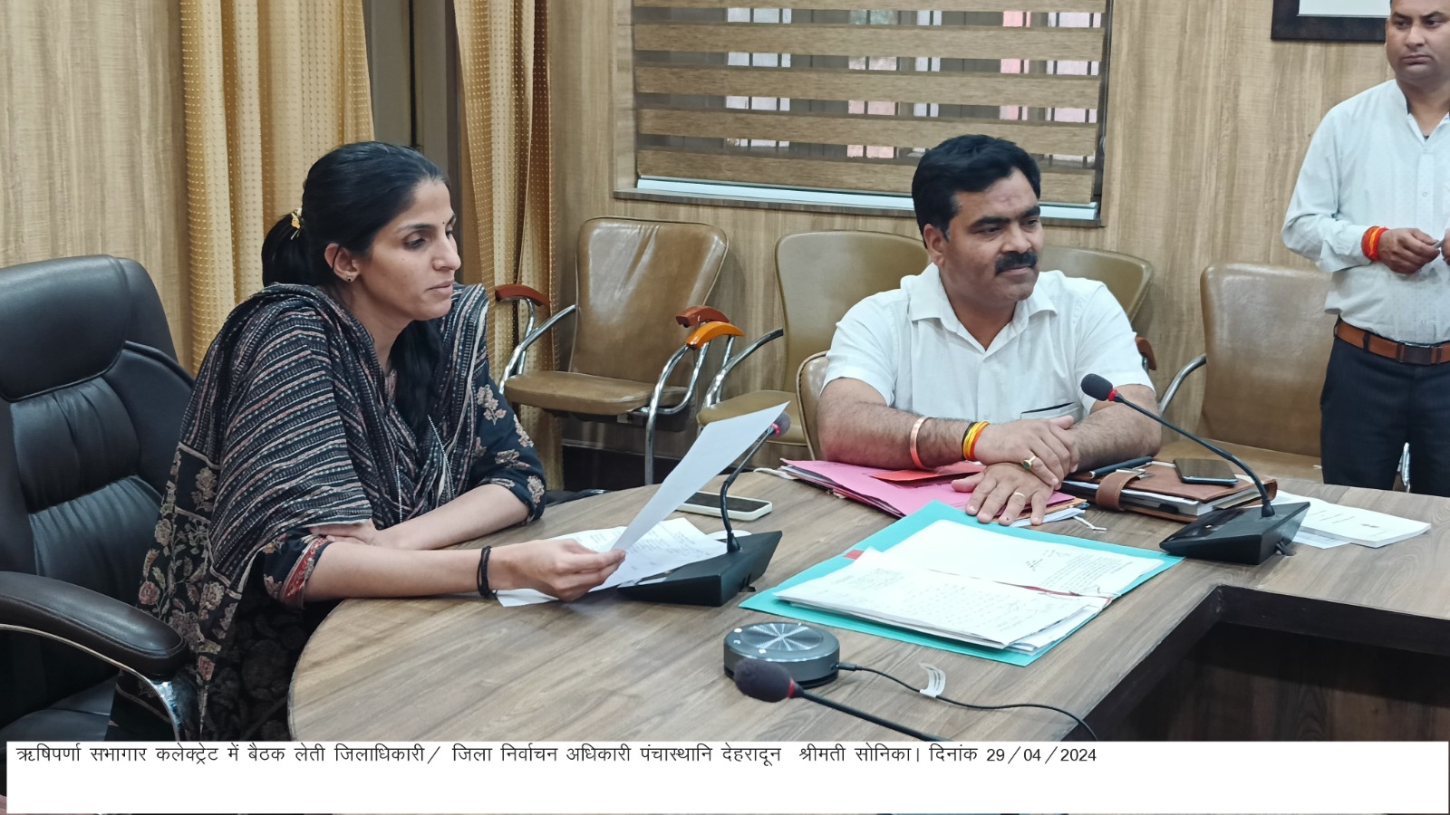जिलाधिकारी/ जिला निर्वाचन अधिकारी पंचास्थानि देहरादून श्रीमती सोनिका ने ऋषिपर्णा सभागार कलेक्टेट में बैठक लेते हुए स्थानीय नागर निकाय निर्वाचक नामावलियों के सम्बन्ध में प्राप्त हो रही शिकायतों पर सम्ब्न्धित उप जिलाधिकारियों को आवश्यक दिशा-निर्देश दिए।