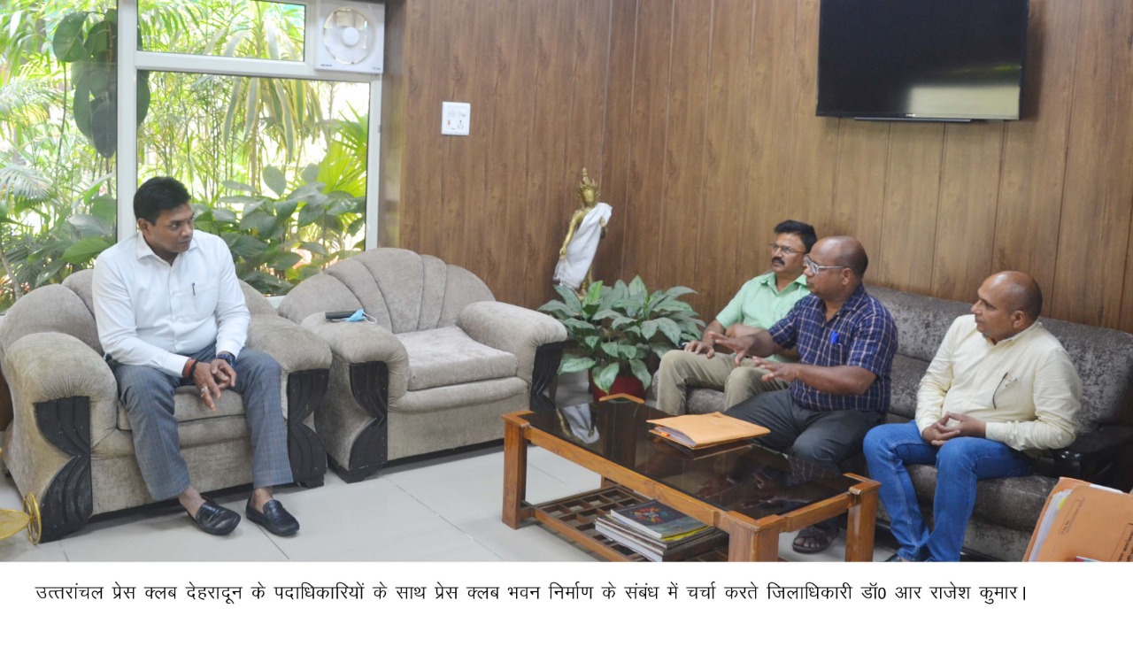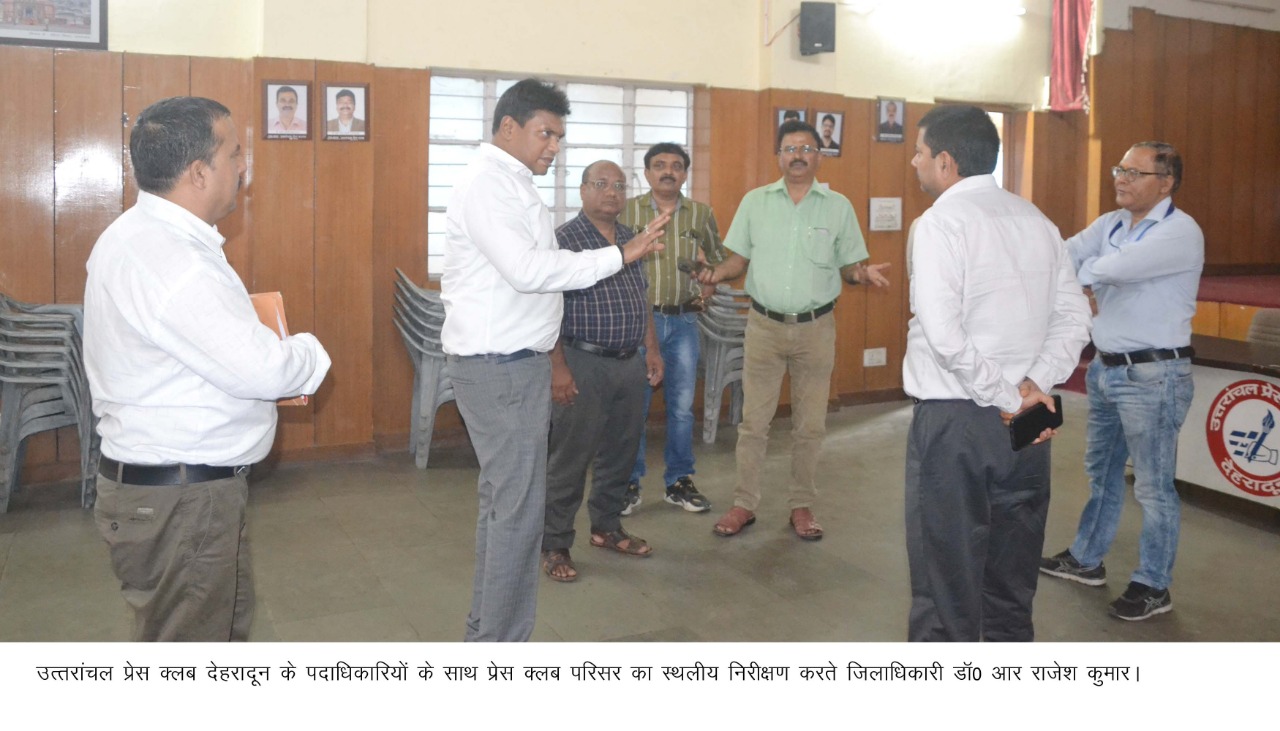 मा0 मुख्यमंत्री जी उत्तराखण्ड सरकार की उत्तरांचल प्रेस क्लब देहरादून भवन निर्माण के संबंध में की गई घोषणा में जिलाधिकारी डाॅ0 आर राजेश कुमार ने आज उत्तरांचल प्रेस क्लब देहरादून के पदाधिकारियों के साथ जिलाधिकारी शिविर कार्यालय में बैठक कर चर्चा की गई। इसके उपरान्त जिलाधिकारी द्वारा प्रेस क्लब परिसर का क्लब के पदाधिकारियों के साथ स्थलीय निरीक्षण किया गया।