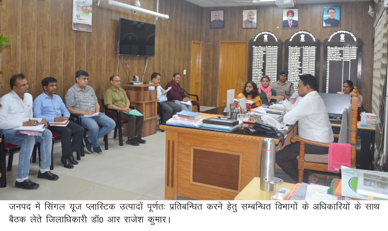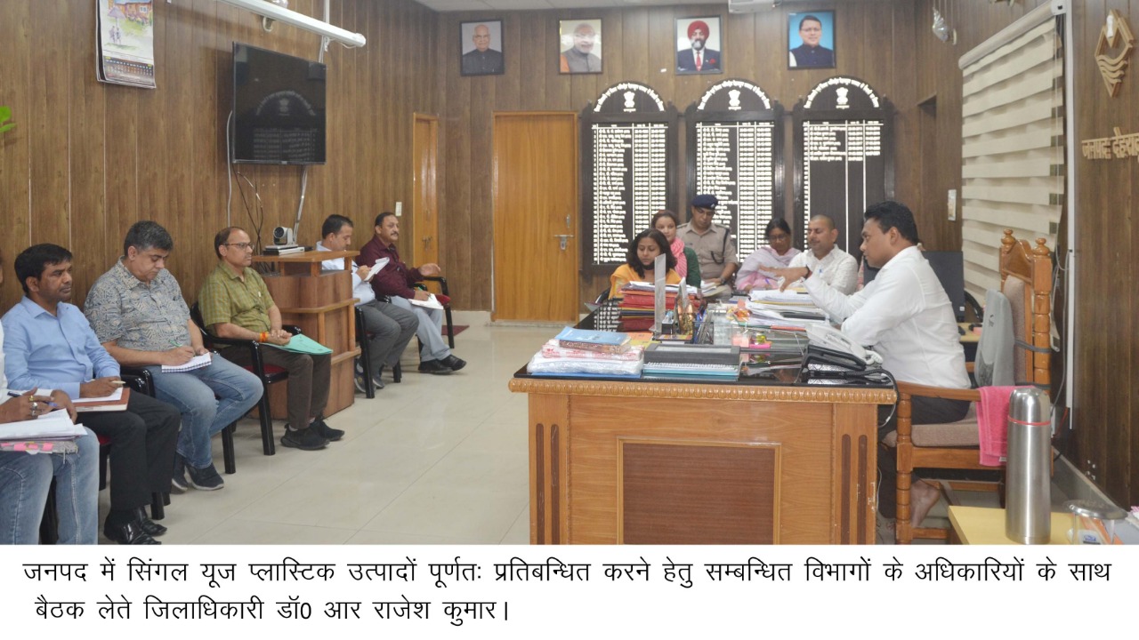 जिलाधिकारी डॉ0 आर राजेश कुमार ने शिविर कार्यालय में सिंगल यूज प्लास्टिक उत्पादों के क्रय-विक्रय, उत्पादन, आयात, भण्डारण, परिवहन, उपयोग व आपूर्ति प्रभावी रूप से समाप्त करने हेतु संबंधित विभागोें के अधिकारियों के साथ बैठक ली। अपर जिलाधिकारी वित्त एवं राजस्व को निर्देशित किया कि जिला प्रशासन, पुलिस, नगर निगम की टीम बनाकर अभियान चलाते हुए जागरूकता एवं प्रतिबन्धित सामग्री जब्त करने की कार्यवाही करें।