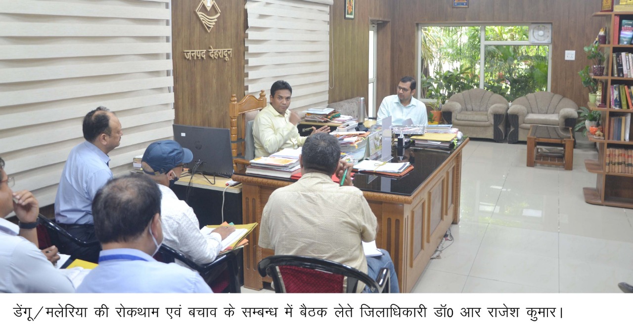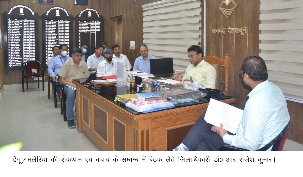 बैठक में मुख्य नगर आयुक्त नगर निगम देहरादून मनुज गोयल ने डेंगू/मलेरिया उन्मूलन के अन्तर्गत चलाये गए अभियान तथा डेंगू/मलेरिया की रोकथाम हेतु नगर निगम देहरादून द्वारा की जा रही तैयारियों एवं योजनाओं की जानकारी जिलाधिकारी को दी।