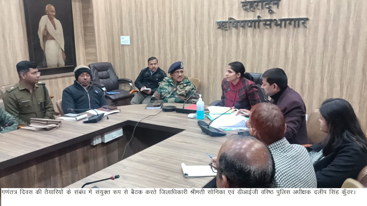गणतंत्र दिवस की तैयारियों एवं विभिन्न व्यवस्थाओं के संबंध में जिलाधिकारी श्रीमती सोनिका एवं डीआईजी/वरिष्ठ पुलिस अधीक्षक दलीप सिंह कुँवर की संयुक्त अध्यक्षता में ऋषिपर्णा सभागार कलेक्ट्रेट में संबंधित अधिकारियों के साथ बैठक आहूत की गई। जिलाधिकारी ने सभी अधिकारियों को गणंतत्र दिवस में आयोजित होने वाले कार्यक्रम के सफल सम्पादन हेतु मानसिक रूप से तैयार रहने के निर्देश दिए। उन्होंने कहा कि कार्यक्रम की विस्तृत रूपरेखा एवं दायित्वों के सम्बन्ध में अगली बैठक में विस्तृत दिशा-निर्देश दिए जाएंगे।