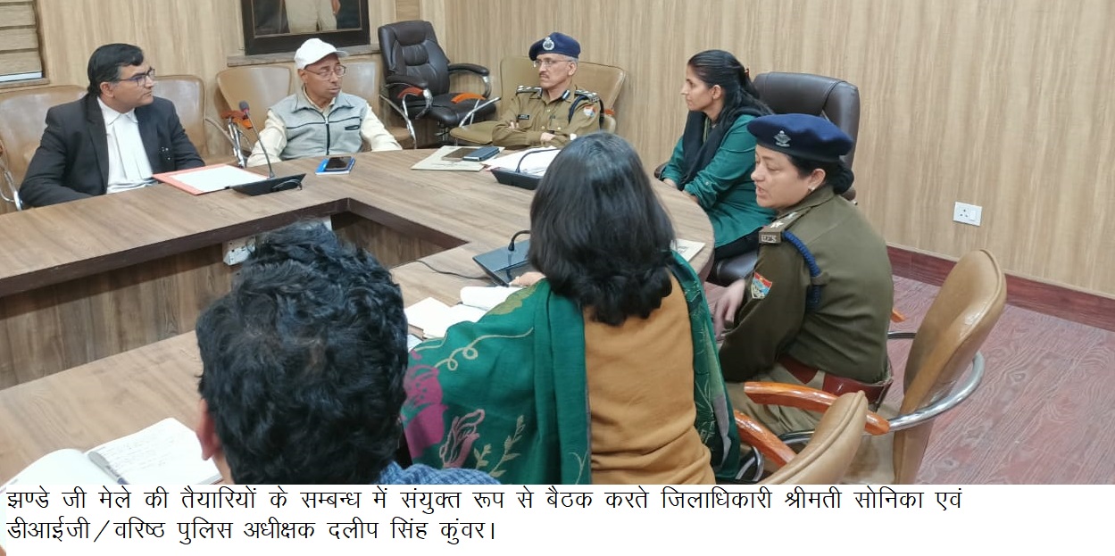 जिलाधिकारी श्रीमती सोनिका एवं वरिष्ठ पुलिस अधीक्षक दलीप सिंह कुंवर की संयुक्त अध्यक्षता में ऋषिर्णा सभागार कलेक्टेट में स्थानीय झण्डे मेले की व्यवस्थाओं के संबंध में बैठक लेते हुए आवश्यक दिशा-निर्देश दिए। इस वर्ष स्थानीय झण्डे जी मेले में भारी संख्या में श्रद्धालुओं के आने की संभावना है जिसको लेकर जिला प्रशासन एवं पुलिस सतर्क है।