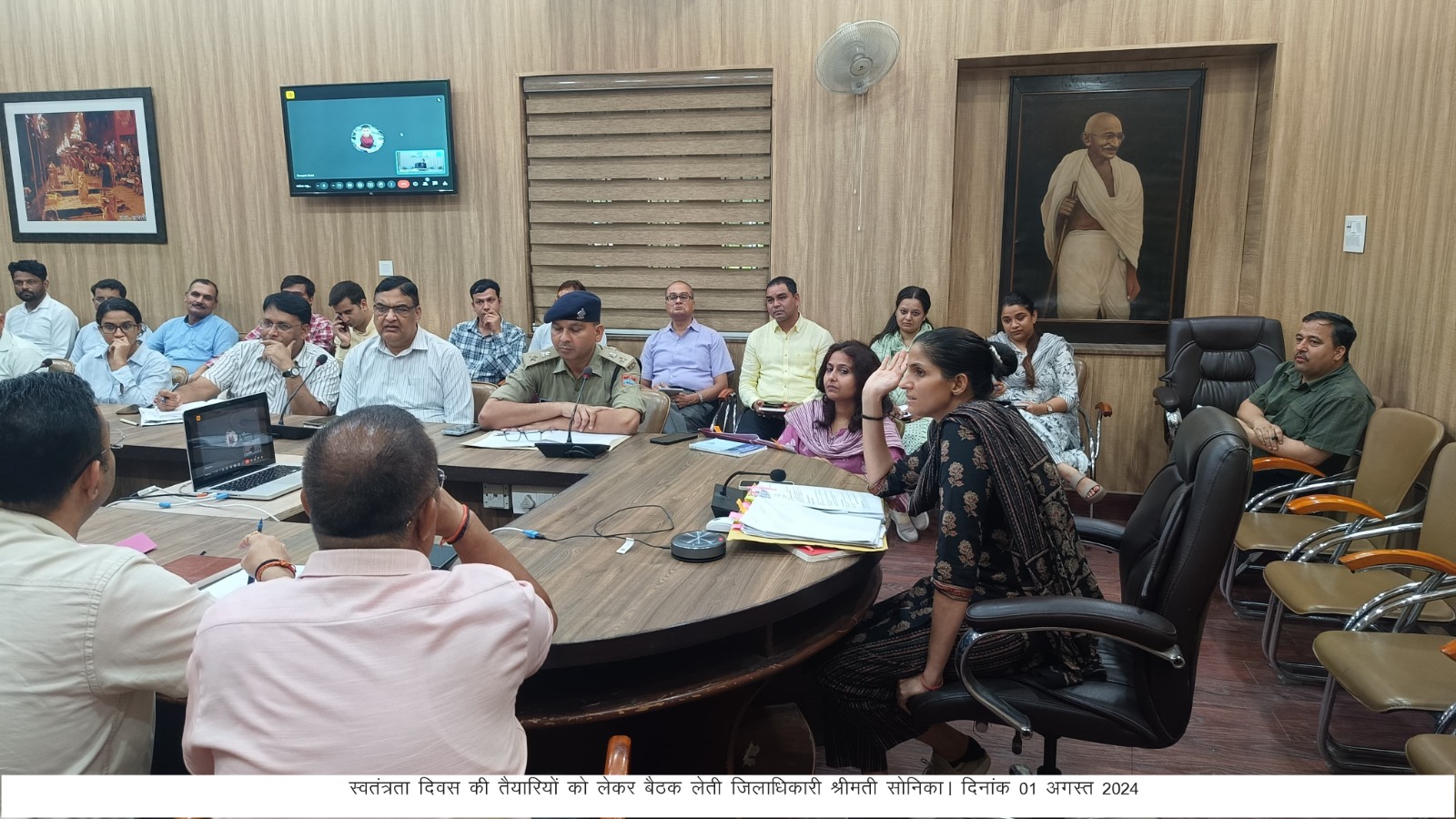 जिलाधिकारी श्रीमती सोनिका ने स्वतंत्रता दिवस 15 अगस्त 2024 की तैयारियों को लेकर ऋषिपर्ण सभागार में बैठक कर सम्बन्धित अधिकारियों को समय पर तैयारी पूर्ण करने के निर्देश दिए।