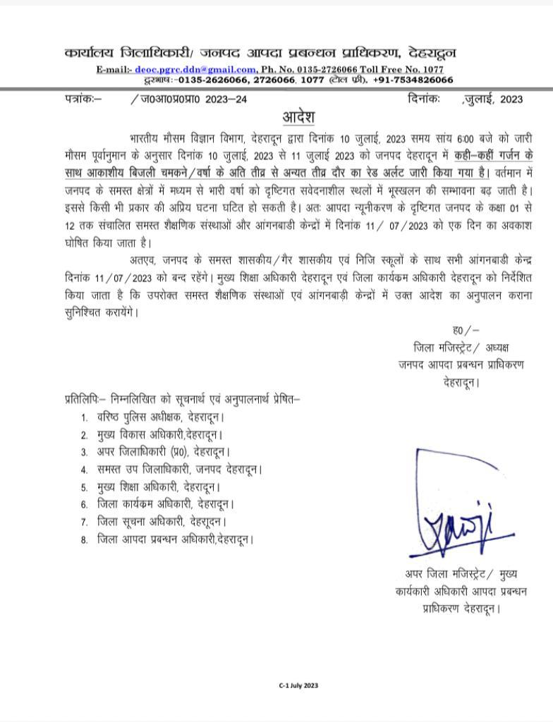 मौसम विभाग द्वारा भारी वर्षा की चेतावनी के दृष्टिगत जिलाधिकारी श्रीमती सोनिका ने कल 11 जुलाई 2023 को जनपद के कक्षा 1 से कक्षा 12 तक के समस्त शासकीय, गैर शासकीय स्कूल, आंगनबाड़ी केंद्र बंद रखने के आदेश दिए हैं।