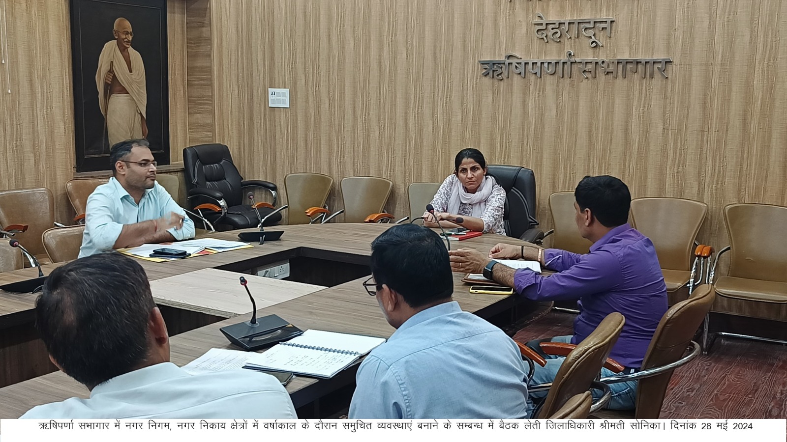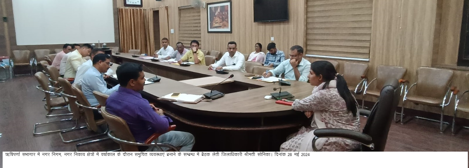 जनपद में वर्षा ऋतु के दृष्टिगत आवश्यक सेवाओं की समुचित व्यवस्था किये जाने के संबंध में जिलाधिकारी श्रीमती सोनिका ने ऋषिपर्णा सभागार में बैठक लेते हुए संबंधित अधिकारियों को आवश्यक दिशा-निर्देेश दिये।