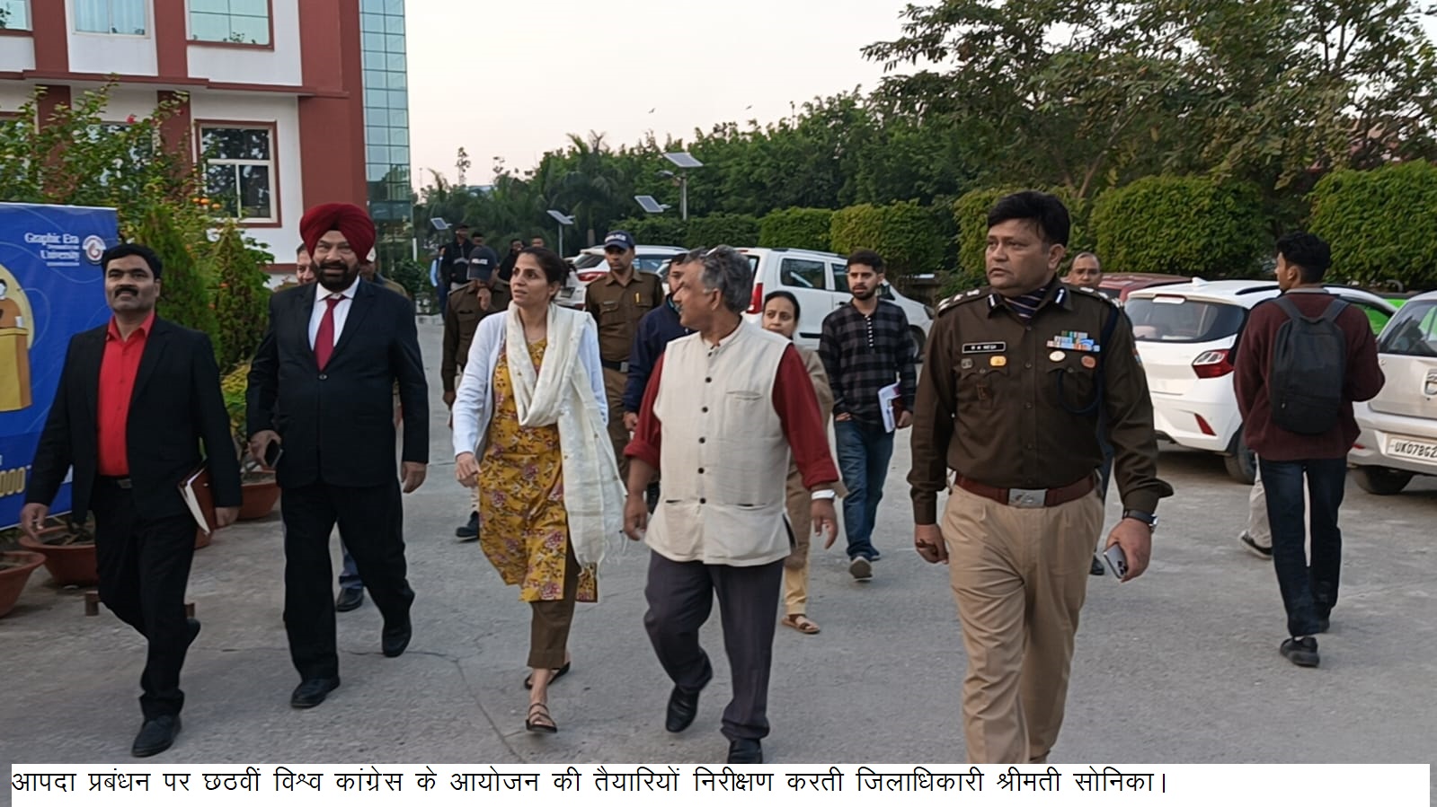 आपदा प्रबंधन पर छठवीं विश्व सम्मेलन का आयोजन की तैयारियों के सम्बन्ध में जिलाधिकारी श्रीमती सोनिका ने आयोजन स्थल ग्राफिकएरा का निरीक्षण कर तैयारियों का जायजा लिया। जिलाधिकारी ने ग्राफिकएरा कालेज/यूनिवर्सिटी में कार्यक्रम स्थल पर आयोजित होेने वाले कार्यक्रम में समस्त व्यवस्थाओं को चाक चौबन्ध बनाने के निर्देश दिए।