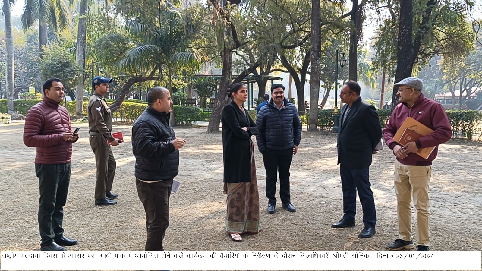 जिलाधिकारी श्रीमती सोनिका ने गांधी पार्क में राष्ट्रीय मतदाता दिवस के अवसर पर 25 जनवरी 2024 को आयोजित होने वाले कार्यक्रम की तैयारियों का निरीक्षण किया। जिलाधिकारी ने सम्बन्धित अधिकारियों को निर्देश दिए कार्यक्रम स्थल पर सभी मूलभूत सुविधाएं यथा विद्युत, पेयजल, मोबाईल टाॅयलेट आदि व्यवस्थाएं सुनिश्चित की जाएं तथा कार्यक्रम में प्रतिभाग करने वाले गणमान्य के आवागमन एवं सीटिंग के साथ ही कार्यक्रम में लगने वाले विभिन्न स्टाॅल आदि सभी सुव्यवस्थित रखें तथा कार्यक्रम स्थल पर सफाई आदि सभी व्यवस्थाएं चाक चैबंद रखने के निर्देश दिएं