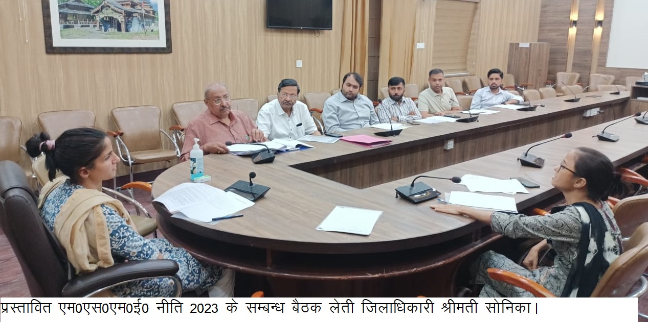 जिलाधिकारी श्रीमती सोनिका की अध्यक्षता में प्रस्तावित एम0एस0एम0ई0 नीति 2023 के सम्बन्ध बैठक आयेाजित करते हुए विभिन्न उद्योग संघो से सुझाव प्राप्त किये गए। जिलाधिकारी ने कहा कि राज्य में नये उद्योग के साथ ही पुराने उद्योग भी स्थापित रहे इसके लिए प्रभावी नीति तैयार करने हेतु सुझाव प्राप्त किये जा रहे। उन्होंने महाप्रबन्धक जिला उद्योग केन्द को निर्देशित किया कि उद्योग संघो के प्रतिनिधियों एवं उद्योगपतियों द्वारा दिए गए सुझावों को संकलित करते हुए शासन को प्रेषित करें।