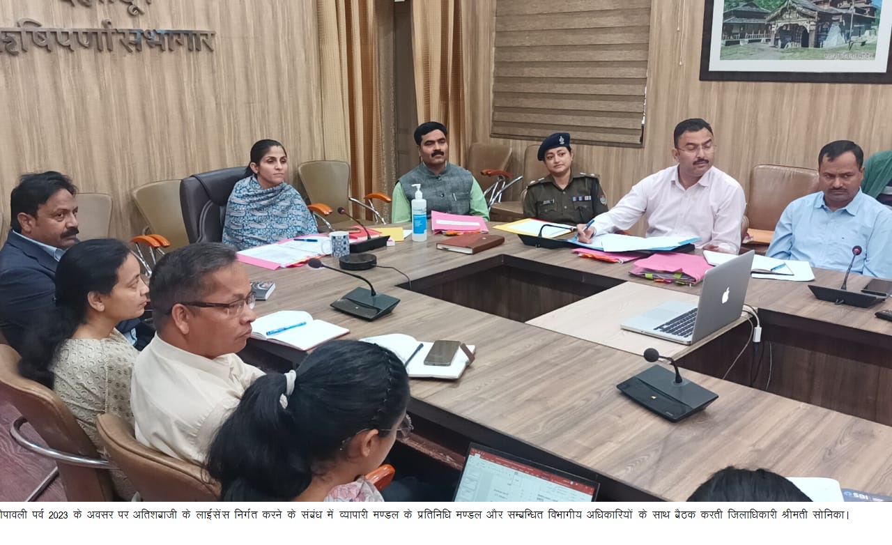 जिलाधिकारी श्रीमती सोनिका ने दीपावली पर्व 2023 के अवसर पर अतिशबाजी के लाईसेंस निर्गत करने के संबंध में व्यापारी मण्डल के प्रतिनिधि मण्डल और सम्बन्धित विभागीय अधिकारियों के साथ बैठक आयोजित की गयी।