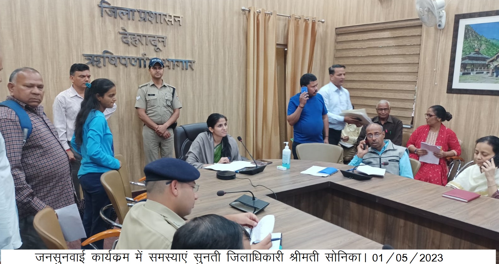 जनसुनवाई में कांवली रोड निवासी श्रीमती रजनी ने अपनी 06 वर्षीय पुत्री रोशनी का विद्यालय में दाखिला कराने के अनुरोध पर जिलाधिकारी ने जिला शिक्षा अधिकारी को रोशनी स्कूल में दाखिला दिलाने की कार्यवाही करतेे हुए सूचना से अवगत कराने के निर्देश दिए। ग्राम आसोई चकराता में निजी एवं वन भूमि सहित टौंस नदी में अवैध खनन की शिकायत पर जिलाधिकारी ने जिला खनन अधिकारी, वन विभाग एवं राजस्व विभाग के अधिकारियों को कार्यवाही के निर्देश दिए। ग्राम सैसा पो0 कोरूवा विकासखण्ड कालसी निवासी किशन सिंह ने बरसात में खेतों में खतरा बना रहता है उनके द्वारा खेतों के पास पुलिया निर्माण करने का अनुरोध किया गया, जिस पर जिलाधिकारी ने मुख्य विकास अधिकारी को कार्यवाही के निर्देश दिए। बहादुरपुर रोड सेलाकुई निवासी पिंकी ने अपनी शिकायत की कि उनके पति की वर्ष 2019 में मृत्यु हो गई थी उनके पति द्वारा होमलोन लिया गया था, जिसमें दुर्घटना बीमा था, बैंक द्वारा मकान को सील लगा दी गई तथा दुर्घटना बीमा राशि का भुगतान नही किया जा रहा है, जिस पर जिलाधिकारी ने एलडीएम को कार्यवाही के निर्देश दिए। वन विभाग झाझरा रेंज में नर्सरी में कार्यरत तीन आउटसोर्स कर्मियों द्वारा वर्ष 2022 से वेतन न मिलने की शिकायत की गई, जिस पर जिलाधिकारी ने वन विभाग के अधिकारियों को निर्देश दिए कि सम्बन्धित कार्मिकों को नियमानसुार यथाशीघ्र वेतन जारी किया जाए। इसी प्रकार हरबर्टपुर निवासी एक बुजुर्ग महिला ने बेटे पर सम्पत्ति कब्जाने तथा घर से निकालने की शिकायत पर उप जिलाधिकारी विकासनगर एवं थानाध्यक्ष थाना विकासनगर को कार्यवाही के निर्देश दिए गए। साथ ही तहसील डोईवाला अन्तर्गत भूमि खुर्द्ध-बुर्द्ध करने की शिकायत पर उप जिलाधिकारी डोईवाला को कार्यवाही के निर्देश दिए।