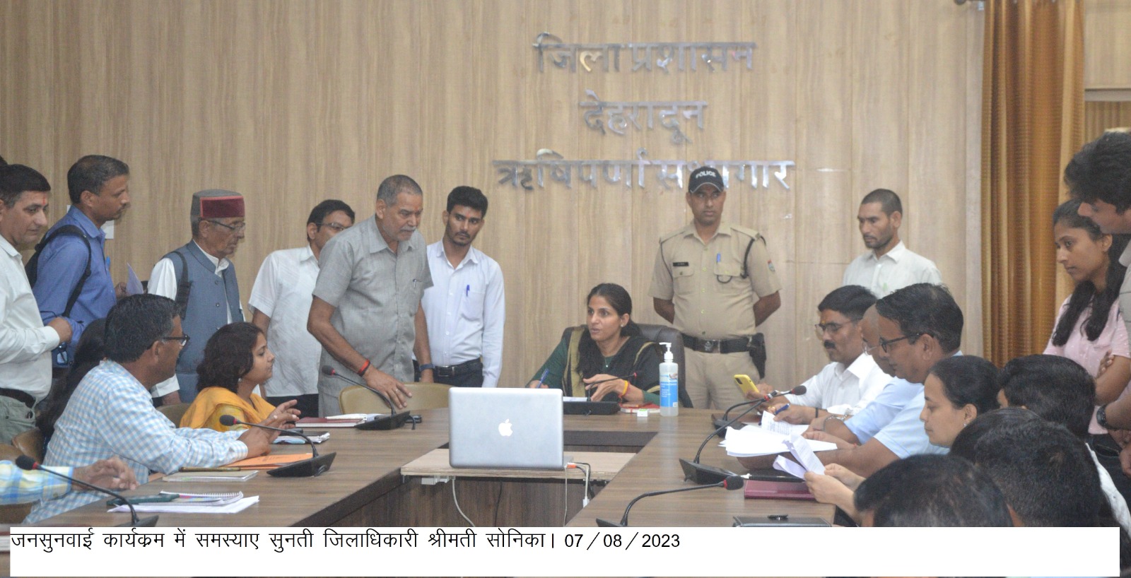 जिलाधिकारी श्रीमती सोनिका की अध्यक्षता में ऋषिपर्णा सभागार कलेक्ट्रेट में प्रत्येक सोमवार की भांति जनसुनवाई कार्यक्रम का आयोजन किया गया। जनसुनवाई में आज 104 शिकायतें प्राप्त हुई। अधिकतर शिकायतें भूमि संबंधी प्राप्त हुई इसके अतिरिक्त शिक्षा, एमडीडीए, नगर निगम, ग्राम्य विकास, पंचायतीराज, सिंचाई, विद्युत, कर्मचारी को रिलिव करने के सम्बन्ध में, पेयजल, नलकूप, पीएमजीएसवाई, पर्यटन खनन, पूर्ति आदि विभागों से संबंधित शिकायतें प्राप्त हुई। जिलाधिकारी ने निर्देशित किया कि जनसुनवाई में प्राप्त हो रही शिकायतों का समयबद्ध निस्तारण करें। सभी विभागों के अधिकारियों को निर्देशित किया कि जनसामान्य को अपनी शिकायतों को लेकर अनावश्यक न भटकना पड़े। साथ ही निर्देश दिए कि विभागीय अधिकारी जनसुनवाई में अपने विभाग से सम्बन्धित प्राप्त हो रही शिकायतों के निस्तारण की समीक्षा करें।  जिलाधिकारी ने समस्त उपजिलाधिकारियों को निर्देश दिए कि भूमि संबंधी प्रकरणों पर त्वरित संज्ञान लेते हुए जांच कर कार्यवाही करें ताकि जनमानस को अनावश्यक ना भटकना पड़े। जनसुनवाई में वृद्ध महिला की पेयजल एवं विद्युत कनैक्शन लगाने की शिकायत पर जिलाधिकारी ने गंभीरता से लेते हुए सम्बन्धित अधिकारियों मौके पर जाकर समस्या का निस्तारण करने के निर्देश दिए। एक वृद्ध पुरूष की शिकायत को जिलाधिकारी ने गंभीरता से लेते हुए हरसंभव सहयोग करने का आश्वासन दिया। एक महिला शिकायतकर्ता ने जिलाधिकारी को बताया कि उनके पुराने घर जो क्षतिग्रस्त होने की कागार में होने के कारण दीवार गिर रही थी, जिस पर मकान को बचाने के लिए दीवार का निर्माण किया जा रहा था पड़ोसी की शिकायत पर एमडीडीए द्वारा चालान की कार्यवाही की गई, उन्होंने मकान निर्माण करने एवं नक्शा दिलाने की मांग की जिस पर जिलाधिकारी ने एमडीडीए के अधिकारियों को प्रकरण को गंभीरता से लेते हुए कार्यवाही के निर्देश दिए। ग्रामीण सड़क निर्माण के दौरान प्रभावित भूमि के मुआवाजा दिलाने की मांग पर जिलाधिकारी ने पीएमजीएसवाई को मामले का निस्तारण करने के निर्देश दिए। इसी तहर आपसी विवाद, भूमि सीमांकन, भूमि विवाद आदि अन्य शिकायत जिलाधिकारी के सम्मुख आई जिसका समयबद्ध निस्तारण करने के निर्देश सम्बन्धित अधिकारियों को दिए गए।