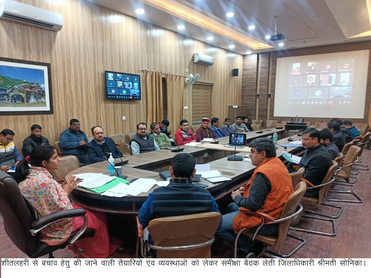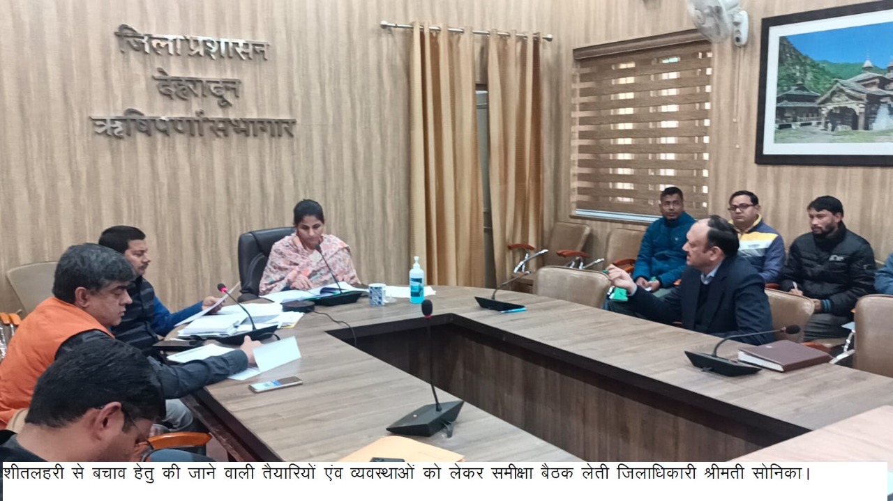 जिलाधिकारी श्रीमती सोनिका ने जनपद में शीतलहरी से पूर्व की तैयारियों के संबंध में ऋषिपर्णा सभागार कलेक्ट्रेट में बैठक आयोजित करते हुए समस्त उप जिलाधिकारियों, नगर निगम देहरादून व ऋषिकेश, नगर पालिका परिषदों, नगर पंचायत सहित संबंधित विभागों के अधिकारियों को आवश्यक दिशा-निर्देश दिए। जिलाधिकारी ने निर्देश दिए कि यह सुनिश्चित कर लिया जाए कि शीतलहरी में कोई भी व्यक्ति रात्रि में खुले में न रहे।