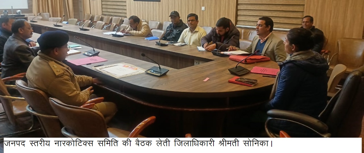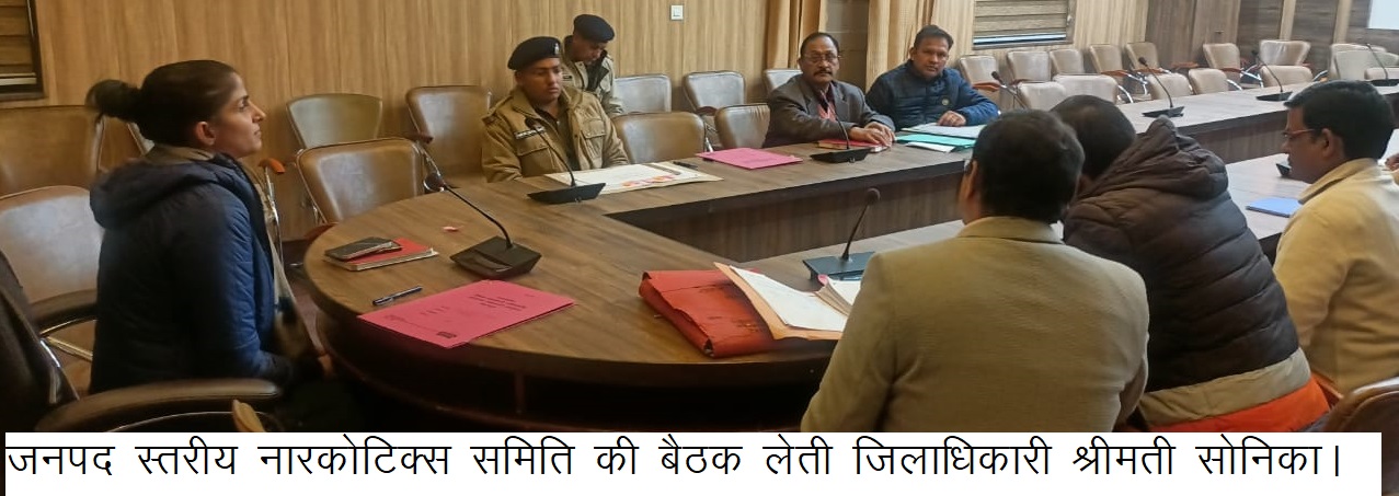 जिलाधिकारी श्रीमती सोनिका की अध्यक्षता में ऋषिपर्णा सभागार में जनपद स्तरीय नारकोटिक्स समिति की बैठक आयोजित की गई। बैठक में जिलाधिकारी ने निर्देशित किया कि जनपद में नशावृत्ति के विरूद्ध नियमित अभियान चलाया जाए। तथा इसमें लिप्त लोगों की काउन्सलिंग भी की जाए। साथ ही जो लोग नशे की प्रतिबंधित सामग्री का व्यापार कर रहे है उन पर भी प्रभावी कार्यवाही करते हुए कानूनी दण्डात्मक कार्यवाही के साथ-साथ उनकी संपत्ति जब्त की कार्यवाही जाए।