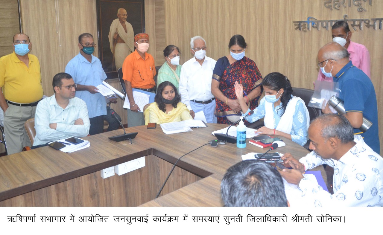 जिलाधिकारी श्रीमती सोनिका की अध्यक्षता में ऋषिपर्णा सभागार में आज प्रातः 11 बजे से 1 बजे तक जनसुनवाई कार्यक्रम का आयोजन किया गया। जनसुनवाई में 75 शिकायतें प्राप्त हुई जिनमें अधिकतर शिकायतें भूमि विवाद, अतिक्रमण, अवैध निर्माण, पेंशन, पेयजल, संपत्ति विवाद, जाति प्रमाण पत्र निर्गत करने, आर्थिक सहायता, बीमा फ्राॅड रकम वापसी, राशन कार्ड बनाने, पशु हानि, में मुआवजा देने, डामटा- चकराता-लाखामण्डल रोड़वेज बस सेवा शुरू करने, अवैध कब्जा, सिंचाई नहर, भूमि प्रदान करने आदि से संबंधित प्राप्त हुई। जिनमें अधिकतर शिकायतों का मौके पर ही निस्तारण किया गया तथा जिन शिकायतों पर जांच/आख्या की आवश्यकता है को संबंधित विभागों को हस्तान्तरित की गई।