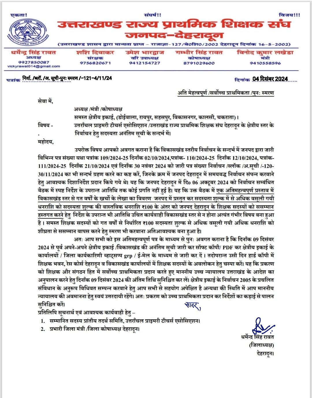 विकासखंड स्तरीय निर्वाचन के सन्दर्भ में जनपद द्वारा जारी विभिन्न पत्र संख्या यथा पत्रांक 109/2024-25 दिनाँक 02/10/2024,पत्रांक- 110/2024-25 दिनाँक 12/10/2024, पत्रांक- 111/2024-25 दिनाँक 21/10/2024 एवं दिनाँक 30 नवंबर 2024 को जारी पत्र संख्या निर्वाचन /ब्लॉक /अ.सूची /-120-30/11/2024 का भी सन्दर्भ ग्रहण करने का कष्ट करें, जिनके क्रम में जनपद देहरादून में समयबद्ध निर्वाचन संपन्न करवाने हेतु आवश्यक दिशानिर्देश प्रदान किये गये थे। यह कि जनपद देहरादून में दिo 06 अक्टूबर 2024 को निर्वाचन सम्बंधित बैठक में स्पष्ट निर्देश के उपरान्त आतिथि तक कोई प्रगति नहीं हुई है। यह कि उक्त बैठक में एक अतिमहत्वपूर्ण प्रस्ताव में विकासखंड स्तर से गत वर्षों के खर्चो के लेखा का विवरण जनपद में प्रस्तुत कर सदस्यता शुल्क में से अधिक वसूली गयी धनराशि को सदस्यता शुल्क की वास्तविक धनराशि ₹100 के अंतर को जनपद देहरादून के शिक्षक सदस्यों को ससम्मान हस्तगत करने हेतु निर्देश के उपरान्त भी आतिथि उचित कार्यवाही विकासखंड स्तर से न होना अत्यंत गंभीर विषय बना हुआ है । समस्त शिक्षक सदस्यों को गत वर्षों से निर्धारित ₹100 सदस्यता शुल्क से अधिक वसूली गयी अधिक धनराशि को शीघ्रता से ससम्मान वापस करने हेतु स्मरण भी करवाना अतिआवश्यक बना हुआ है।