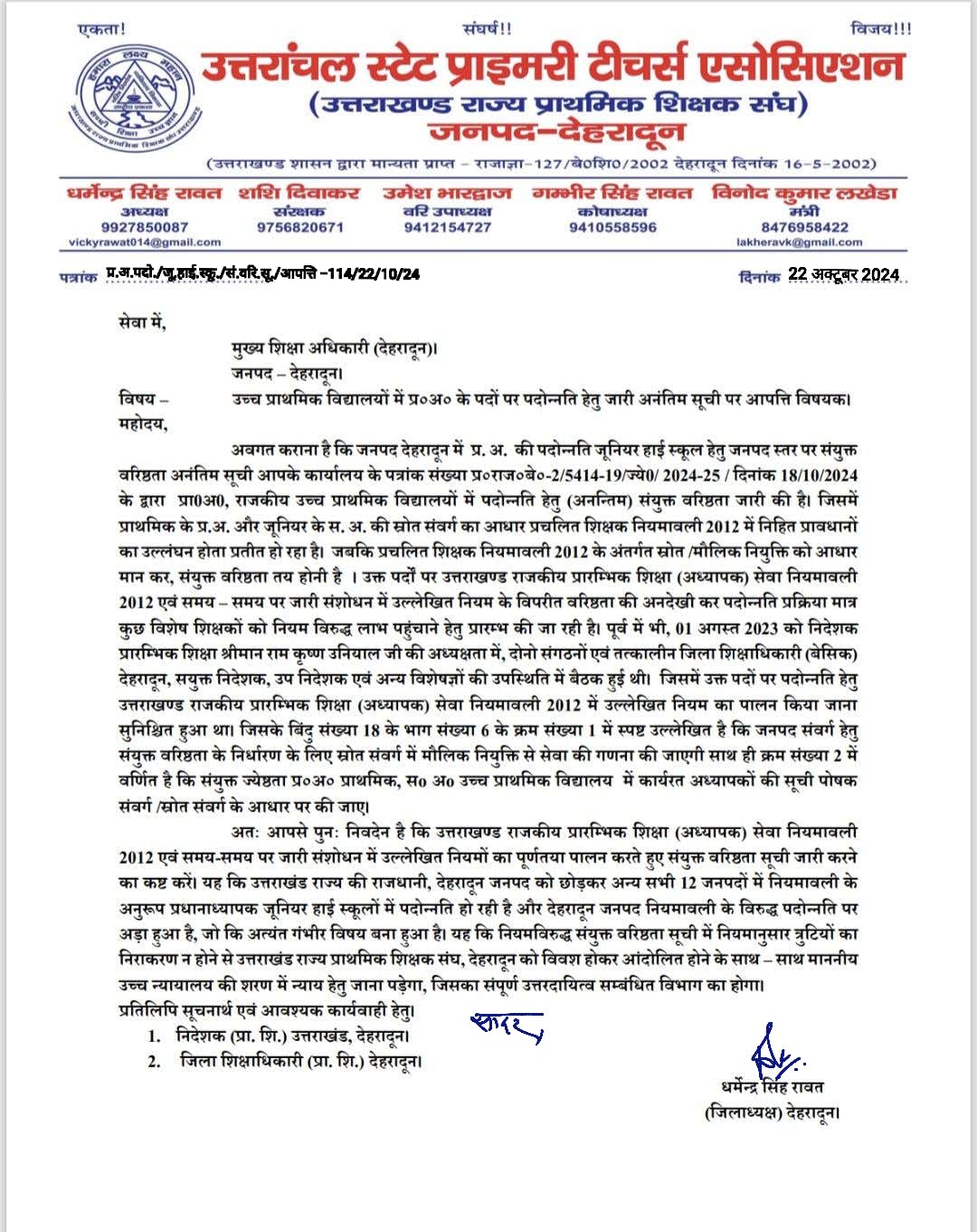 जिलाध्यक्ष धर्मेन्द्र सिंह रावत ने जिला शिक्षाधिकारी (बेसिक) को पत्र लिखा की संयुक्त ज्येष्ठता प्र०अ० प्राथमिक सo अo उच्ब प्राथमिक विद्यालय में कार्यरत अध्यापकों की सूची पोषक संवर्ग /स्रोत संवर्ग के आधार पर की जाए।