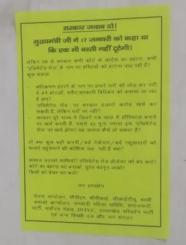 17 जनवरी को मुख्यमंत्री ने कहा था कि एक भी मज़दूर बस्ती नहीं टूटेगी, लेकिन चुनाव होते ही कभी एलिवेटेड रोड के नाम पर, कभी कोर्ट के आदेश के बहाने, कभी फ्लड जोन के नाम पर लगातार लोगों को बेघर करने का प्रयास चल रहा है। इसलिए आज से विभिन्न संगठनों की और से शहर भर में पोस्टर अभियान भी शुरू हो रहा है। इसके द्वारा इस सवाल के साथ अन्य बुनियादी सवालों को पूछे जायेंगे ।