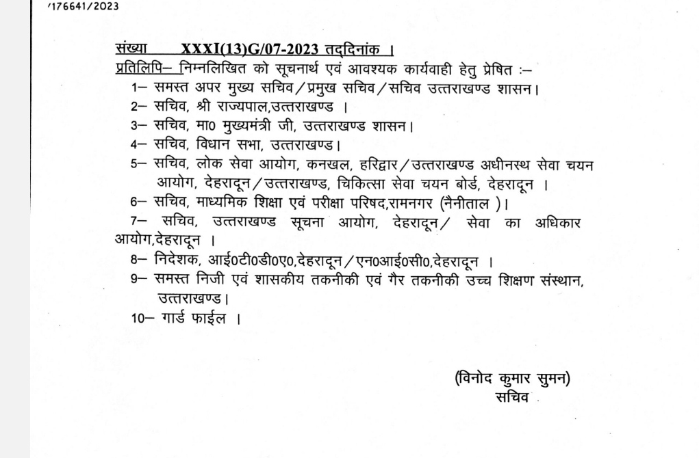 (उत्तराखंड शासन सचिव विनोद कुमार सुमन ने किए आदेश)