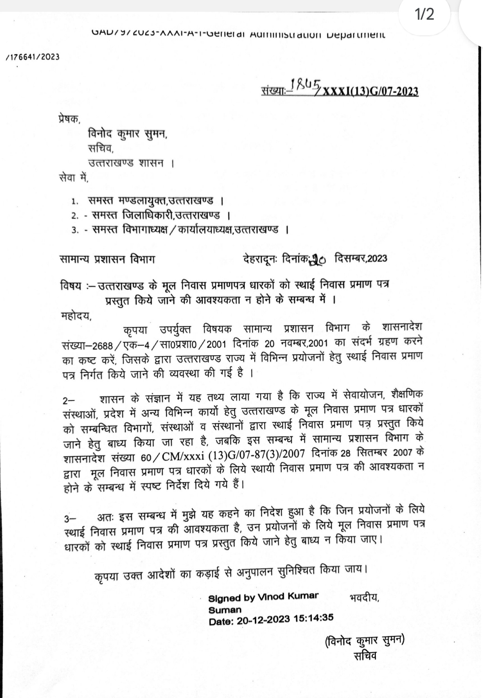 उत्तराखंड शासन सचिव विनोद कुमार सुमन ने आदेश किए की उत्तराखंड के मूलनिवास प्रमाण पत्र धारकों को विभिन्न प्रयोजनों के लिए स्थाई निवास प्रमाण पत्र प्रस्तुत करने की आवश्यकता नहीं है।