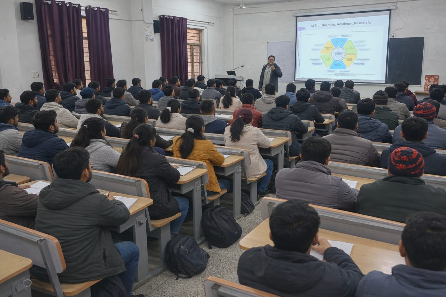 मुख्य वक्ता डॉ. अतुल शिवा ने अपने प्रथम तकनीकी सत्र (प्रातः 10:30 बजे से 12:30 बजे तक) में छात्रों को StudyFetch, Julius AI, Quadratic AI, Gemini, ChatGPT, Perplexity, Claude एवं Agentic AI जैसे निःशुल्क एआई टूल्स की उपयोगिता से अवगत कराया। उन्होंने बताया कि ये उपकरण शोध, डेटा विश्लेषण, नोट्स निर्माण, साहित्य समीक्षा एवं करियर योजना में अत्यंत सहायक हैं। साथ ही उन्होंने एआई के नैतिक एवं जिम्मेदार उपयोग पर भी विशेष बल दिया।
